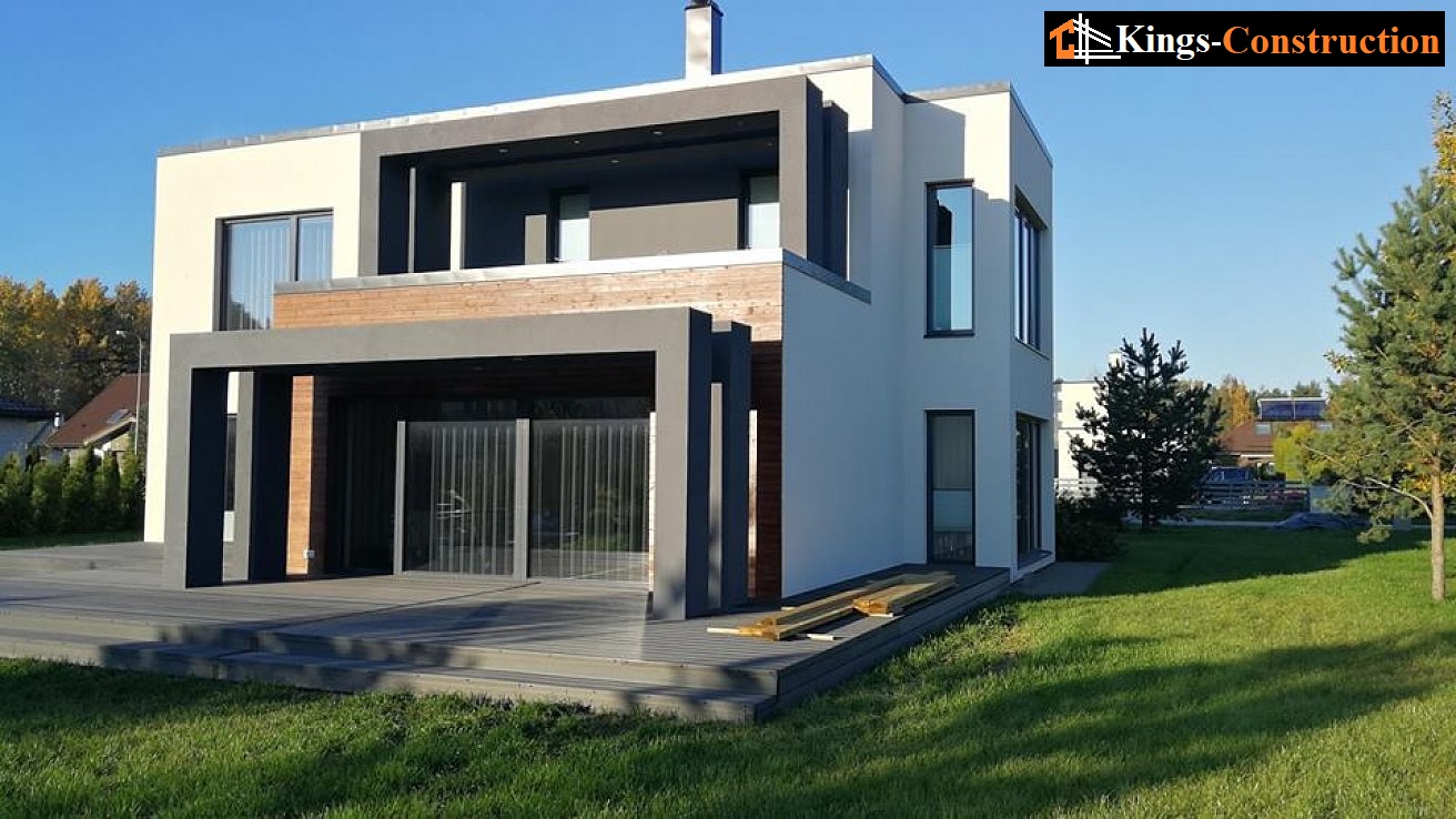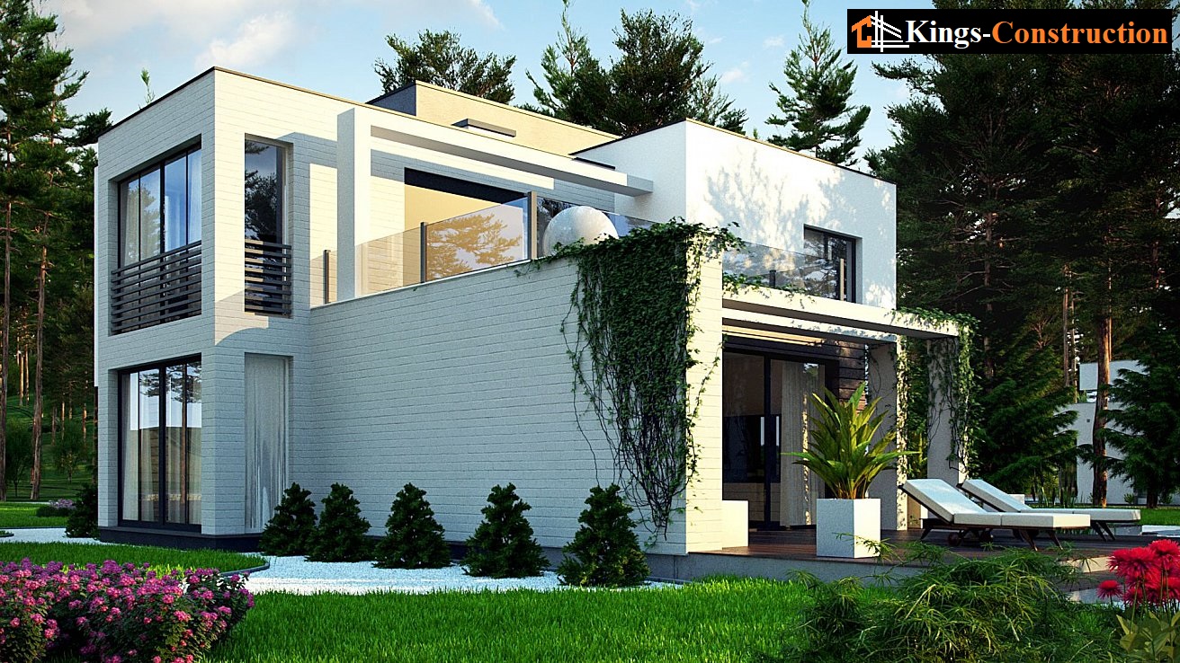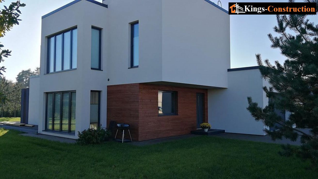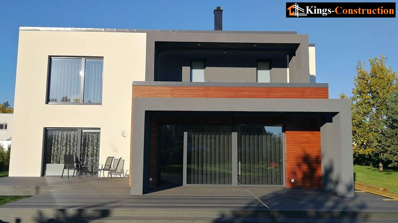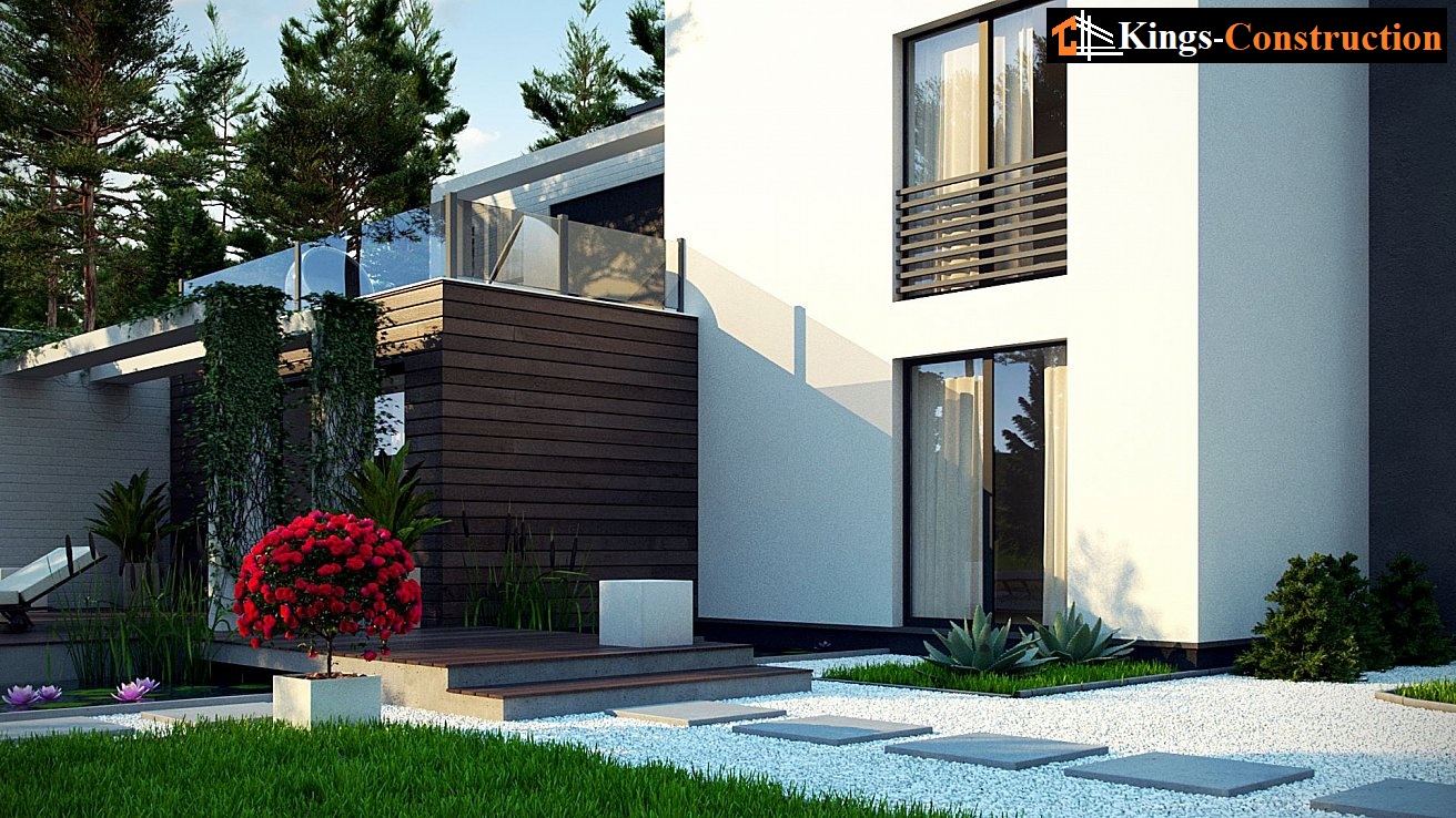 The catalog of two-storey house projects offers a minimalist style house project that looks presentable and modern, because its decoration successfully combines monochrome plaster, natural wood and glass.