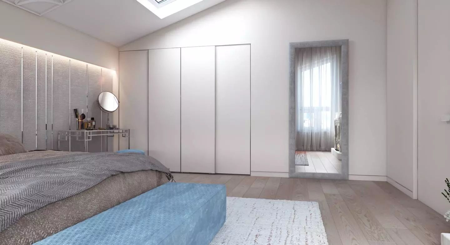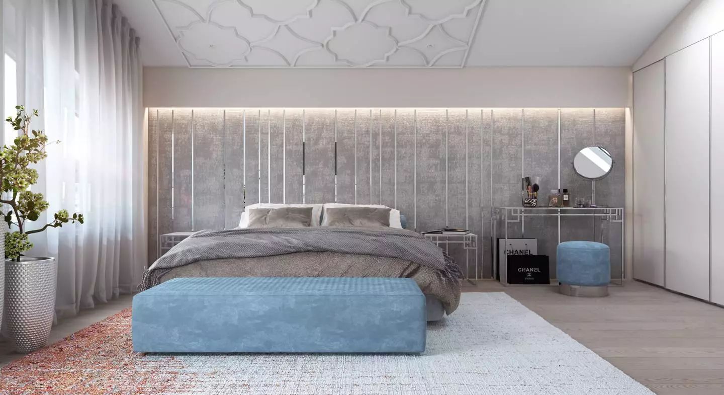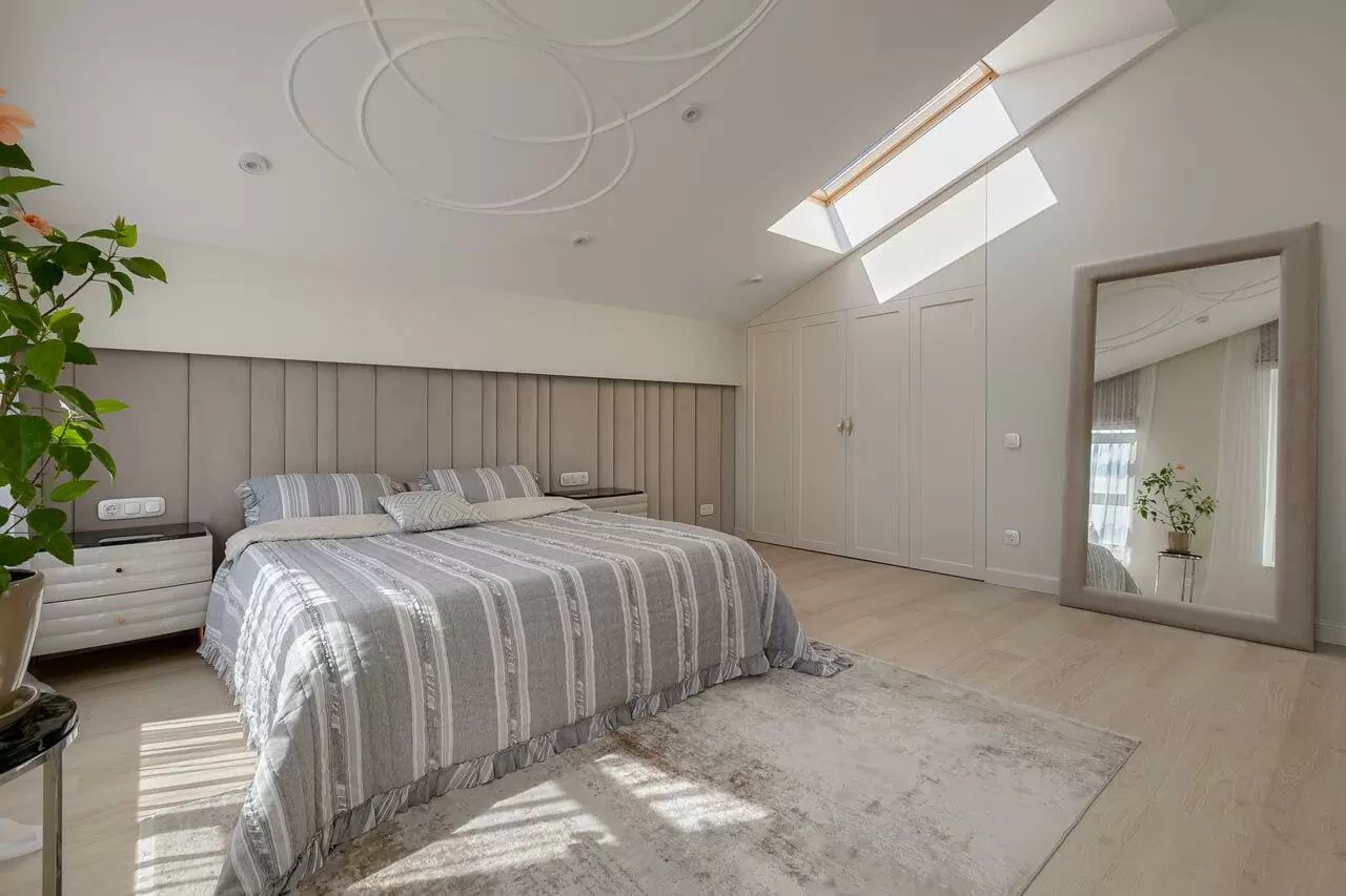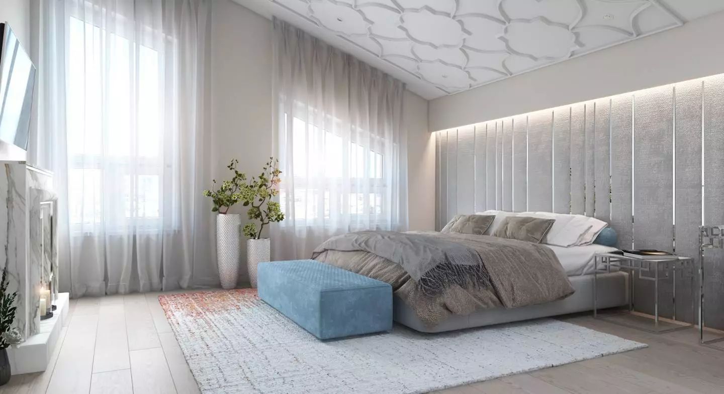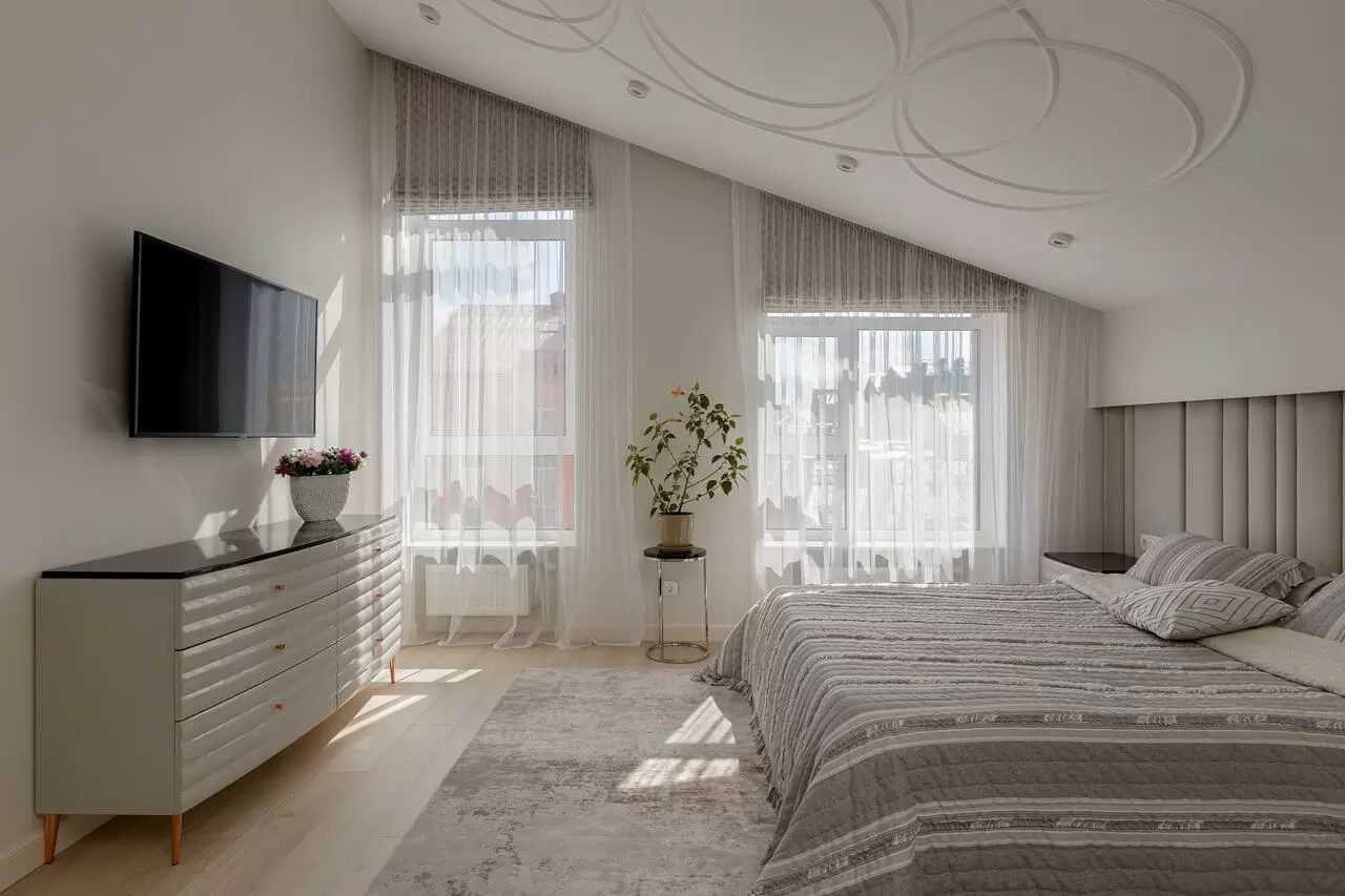A special charm of the bedroom interior is created by decoration: the ceiling was decorated with stucco molding, and one of the walls was decorated with textile panels with mirrored facets, the design of the wall was emphasized with linear illumination. The windows and fireplace also add a cozy atmosphere.