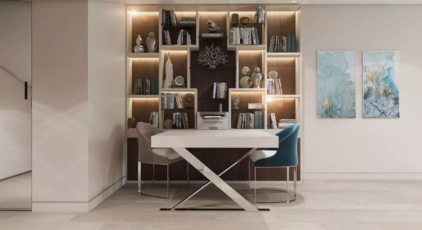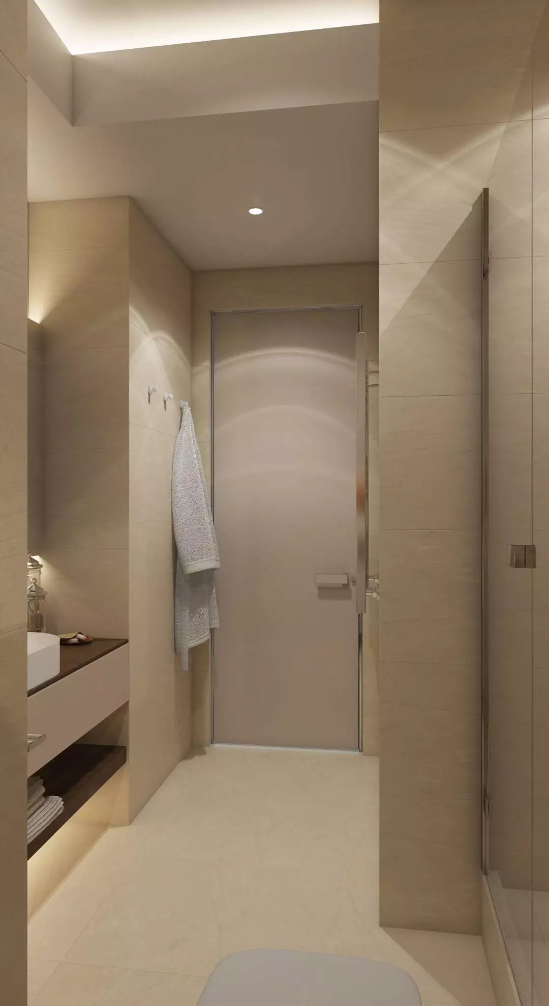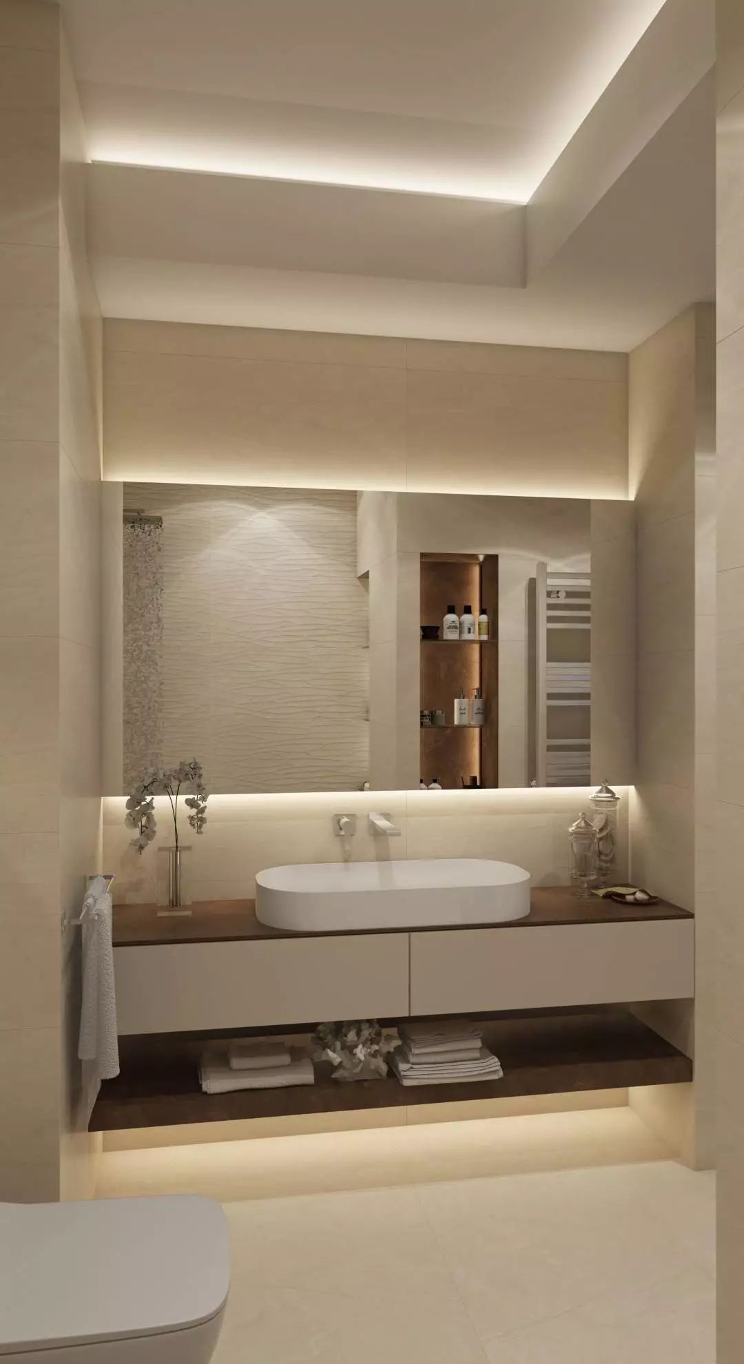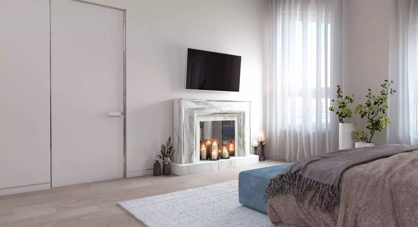 A special charm of the bedroom interior is created by decoration: the ceiling was decorated with stucco molding, and one of the walls was decorated with textile panels with mirrored facets, the design of the wall was emphasized with linear illumination. The windows and fireplace also add a cozy atmosphere.