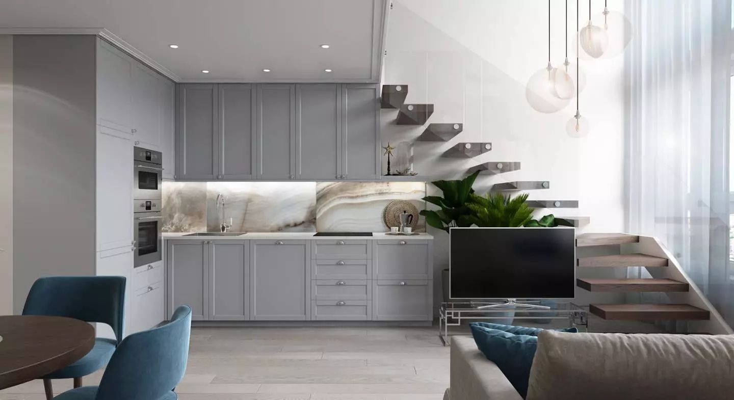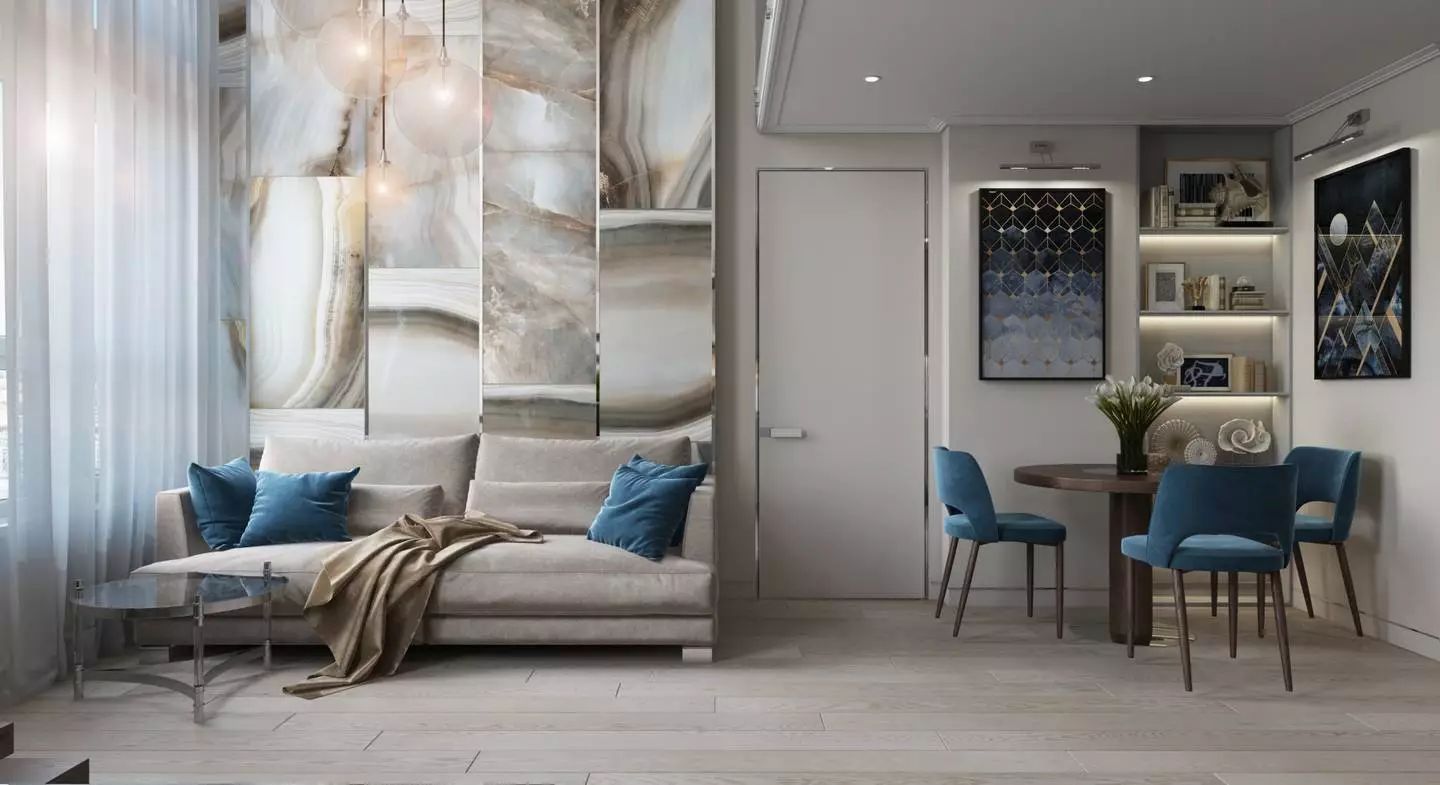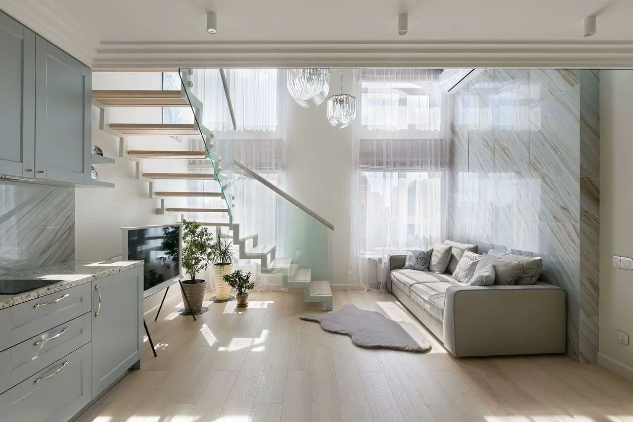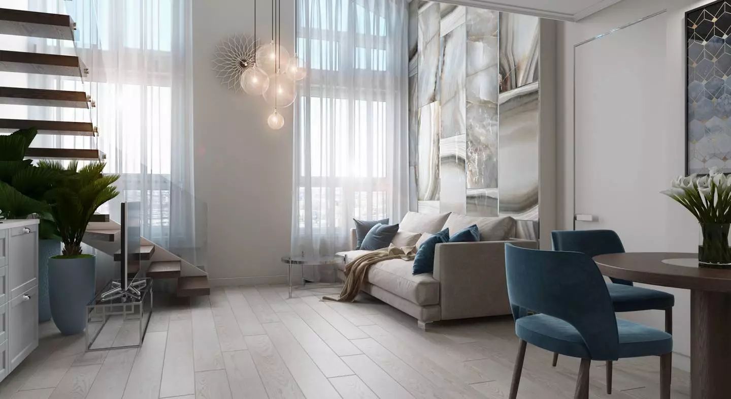 The interior of the kitchen-living room is light and airy, made in the style of modern classics. The accent was made on the decoration of the wall in the living room area – they used stone-like tiles.