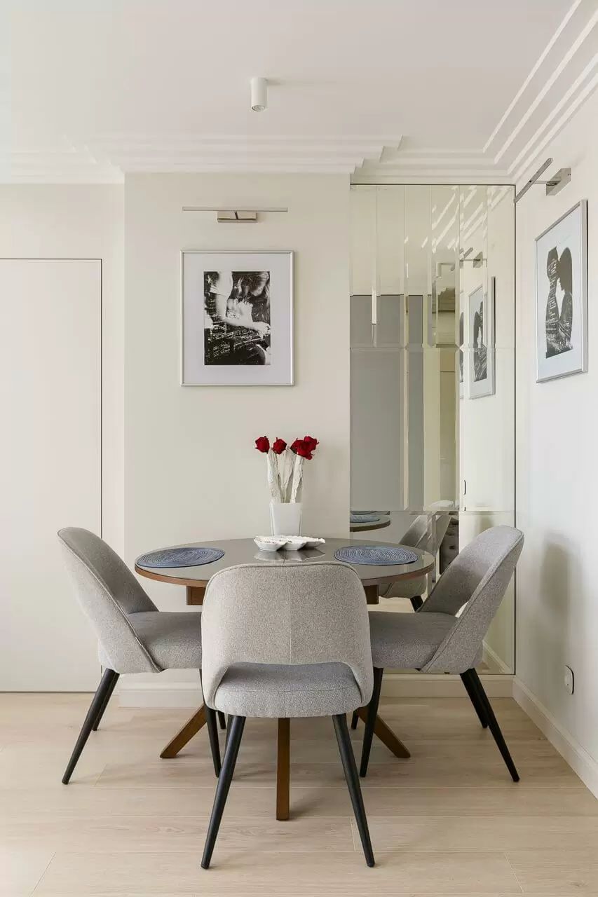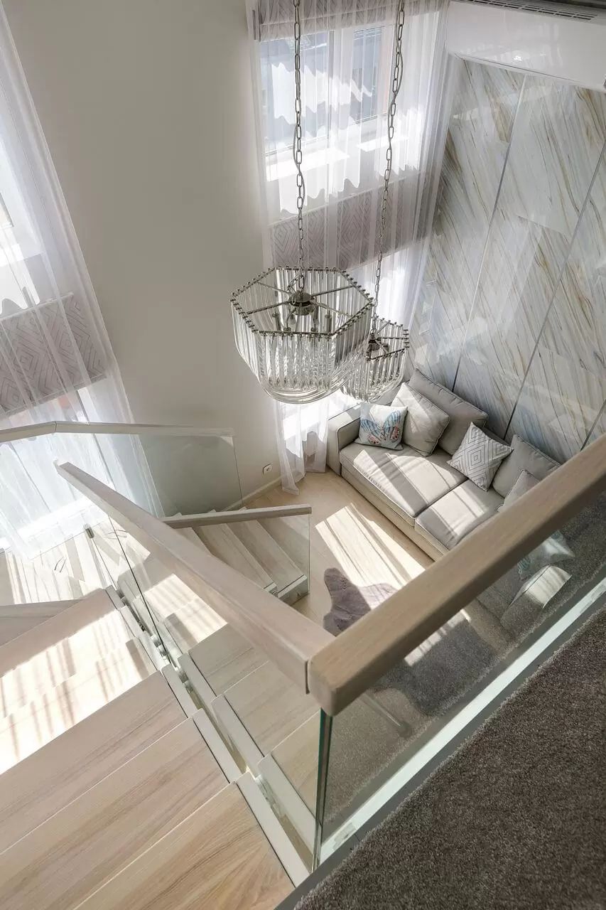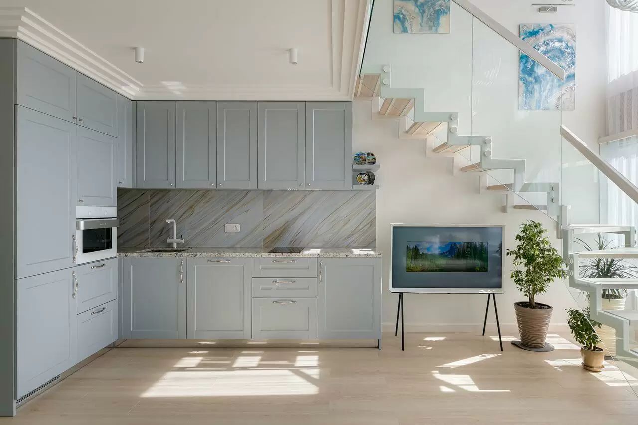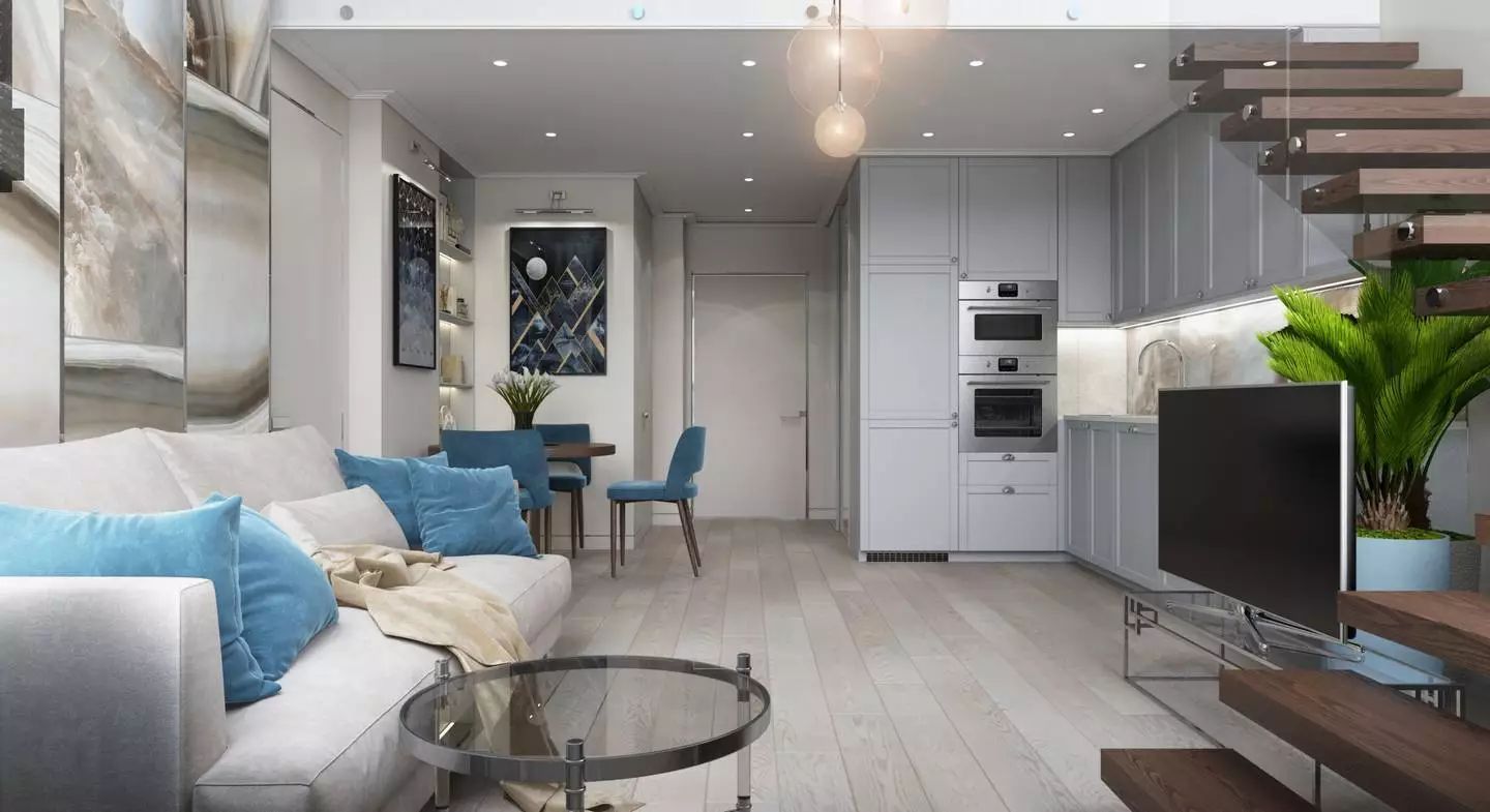 The interior of the kitchen-living room is light and airy, made in the style of modern classics. The accent was made on the decoration of the wall in the living room area – they used stone-like tiles.