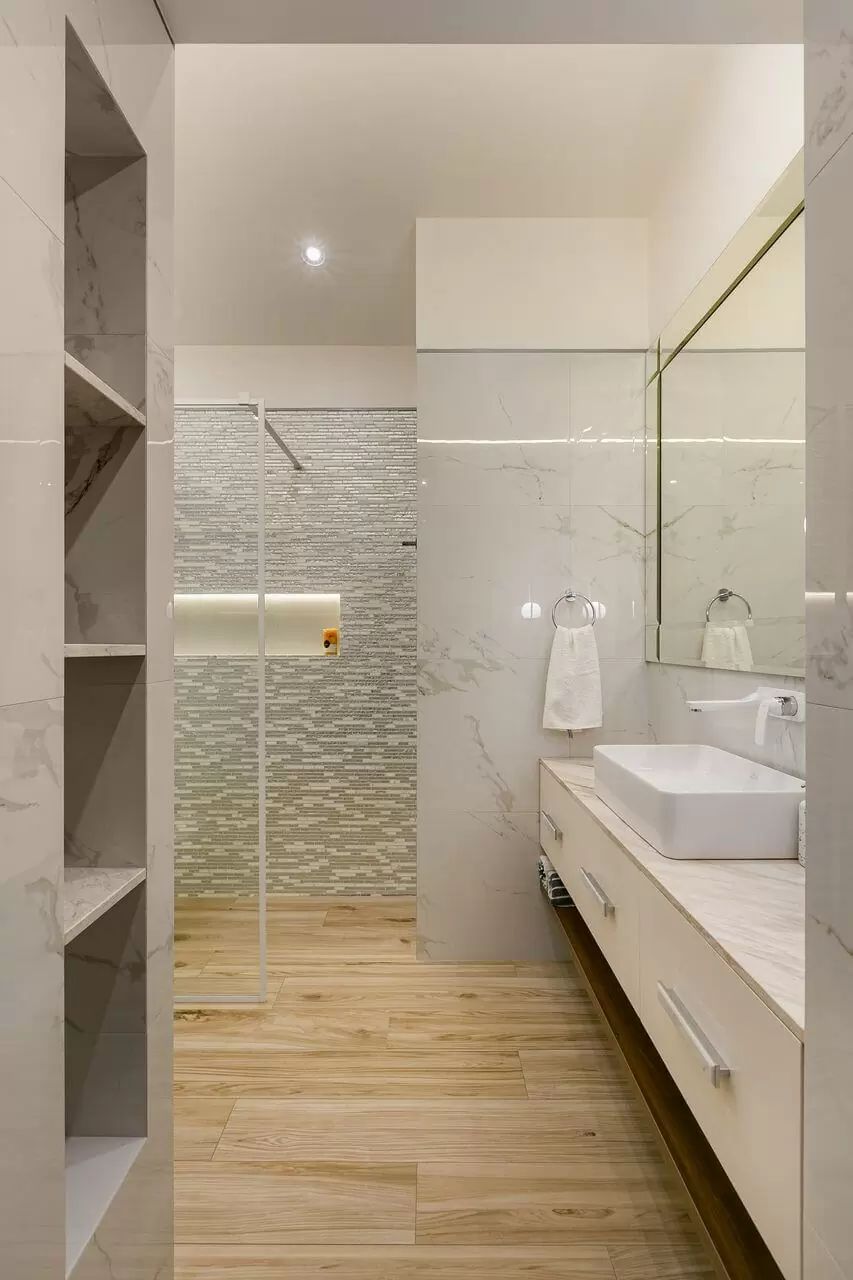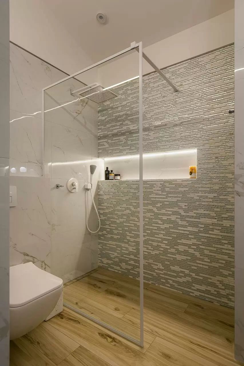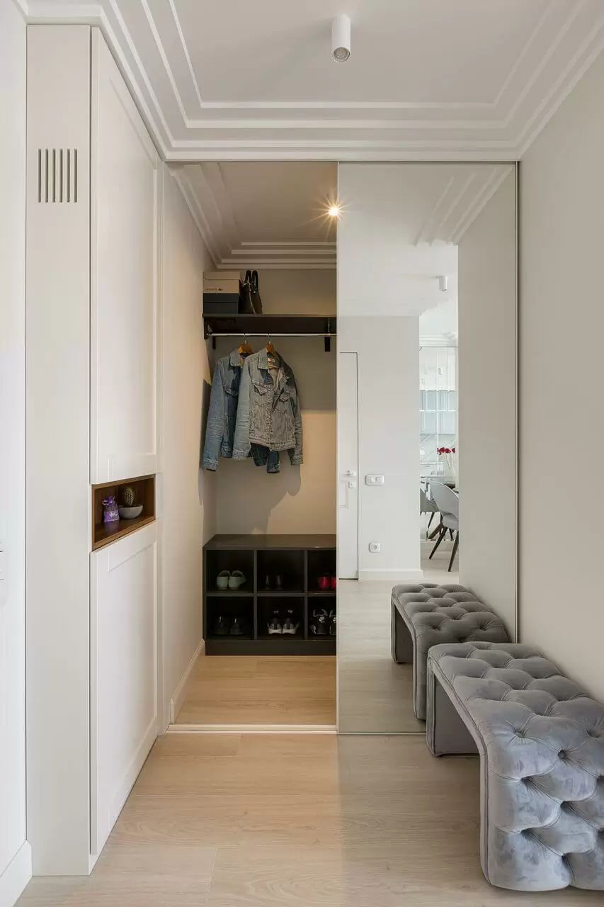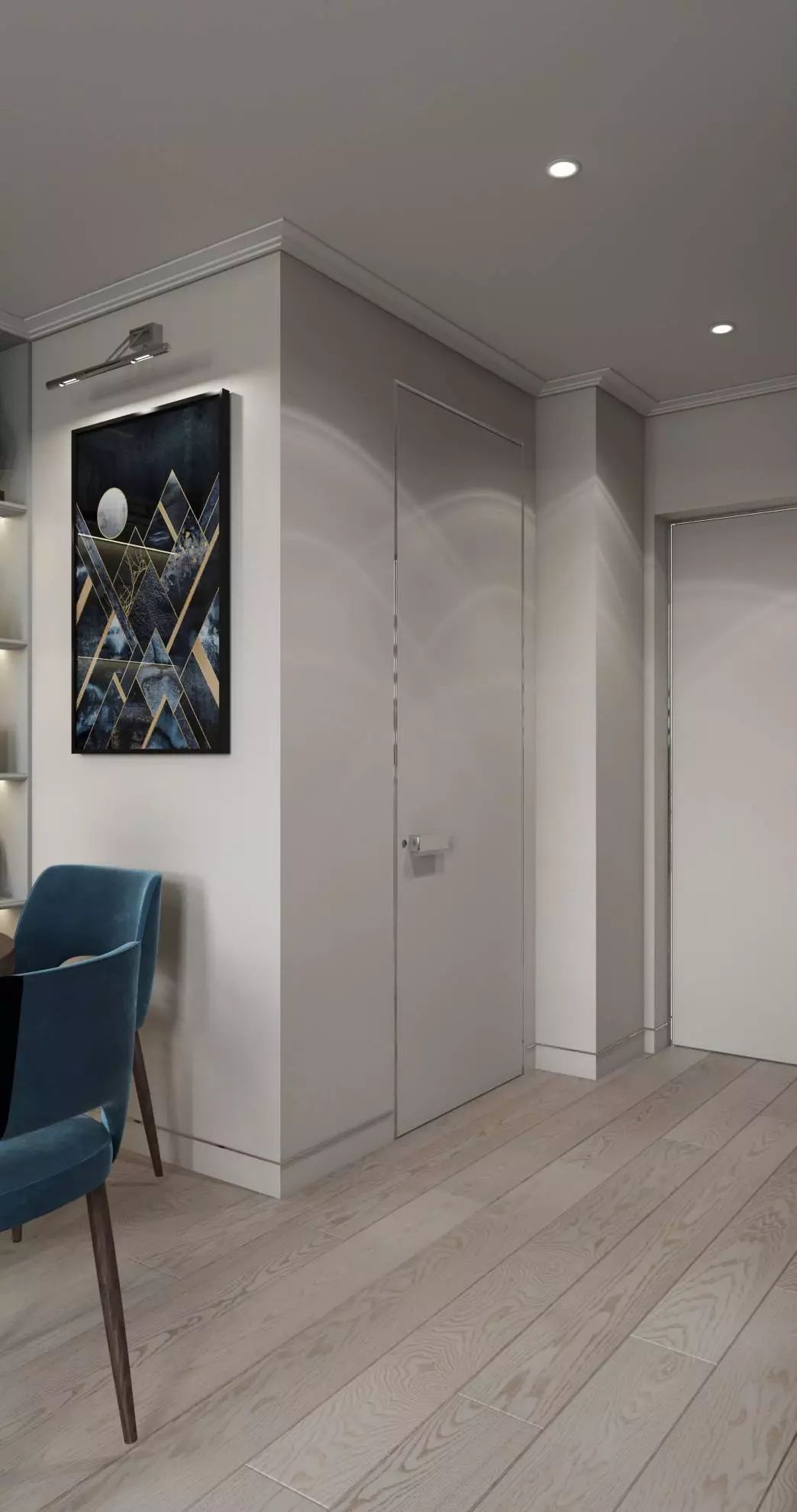 The interior of the kitchen-living room is light and airy, made in the style of modern classics. The accent was made on the decoration of the wall in the living room area – they used stone-like tiles.
