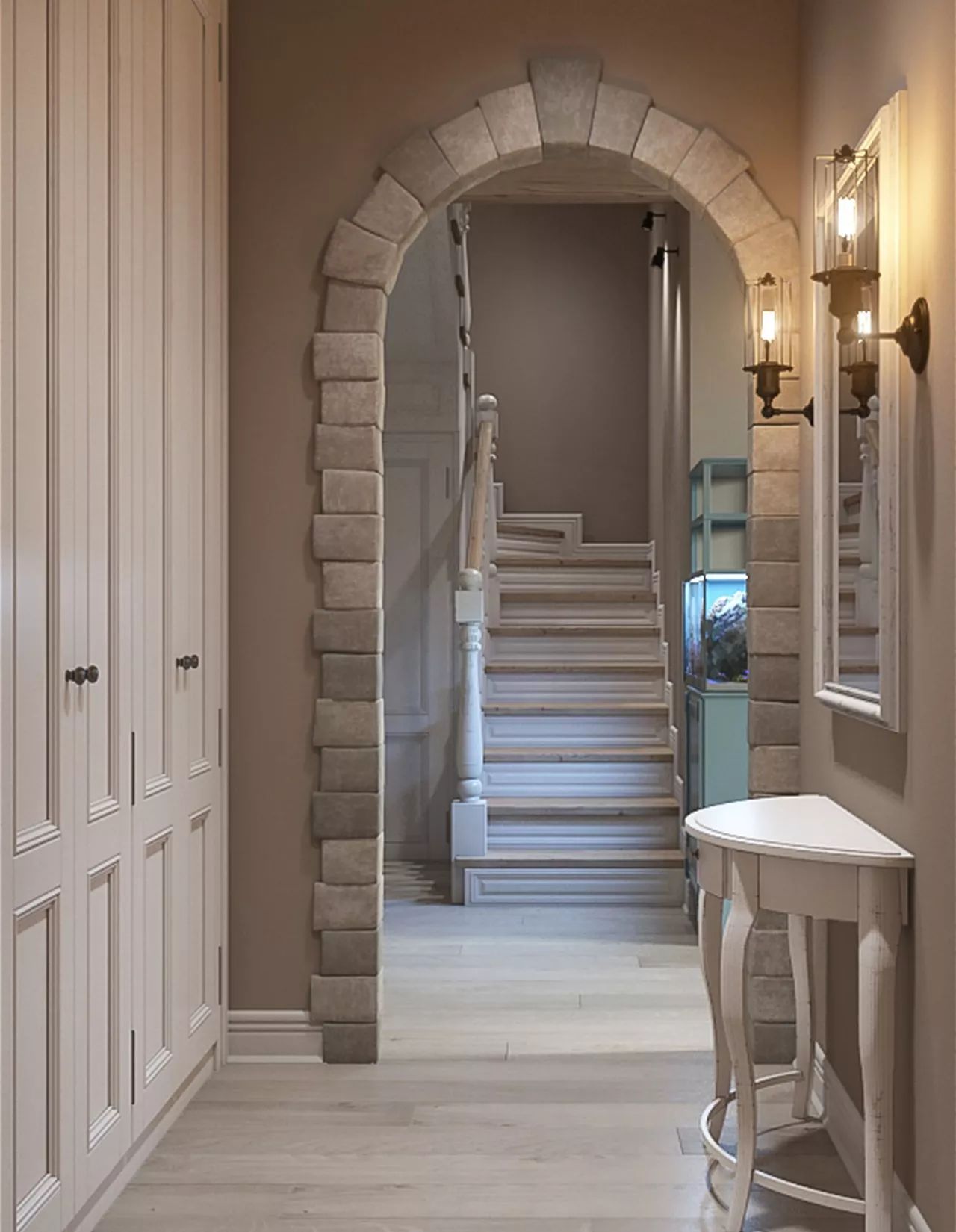 On the ground floor there is a hall, a kitchen-living room, a bedroom, a bathroom and a laundry room. Hall-corridor is made in warm beige colors. Stone was chosen to decorate the arch, and the wall along the wooden staircase was decorated with several paintings. Storage spaces were installed in the corridor at the entrance and in the niche under the stairs.