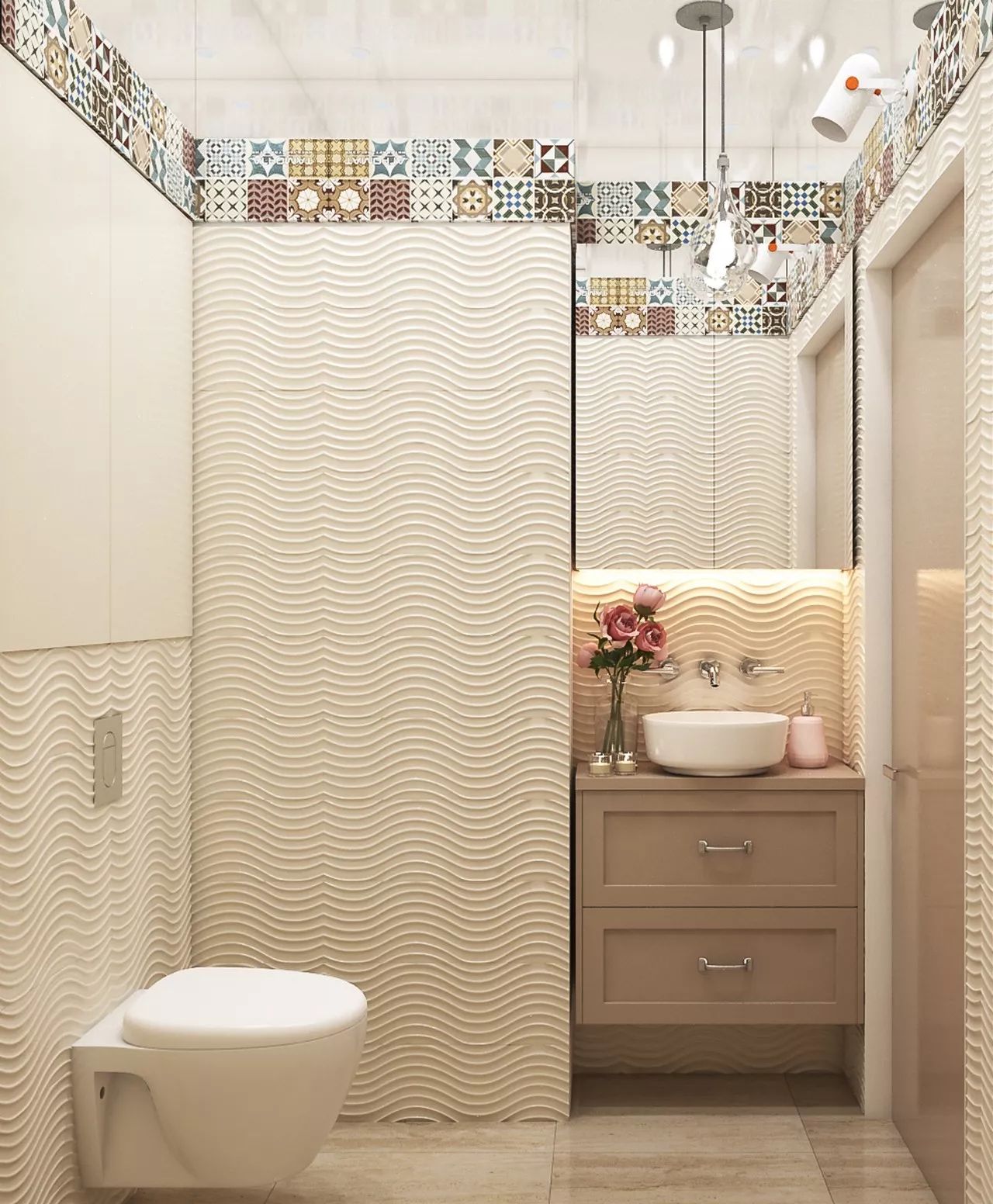 The bathroom on the ground floor is impressive with its wall decoration – the warm illumination of the texture of the undulating panels creates a beautiful effect.