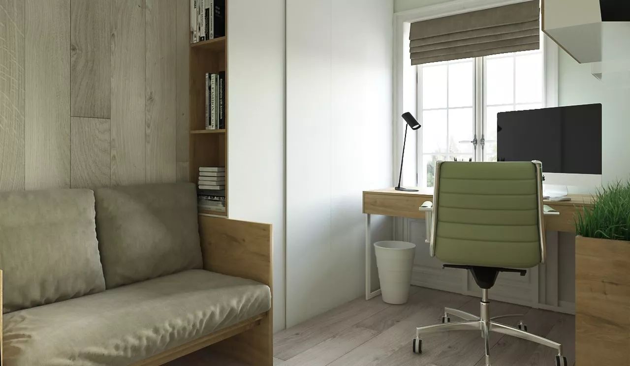 The ability to allocate a separate room for an office plays a huge role for those who often work from home. The necessary minimum for comfortable and productive work is calm colors, a workplace by the window and a relaxation area.