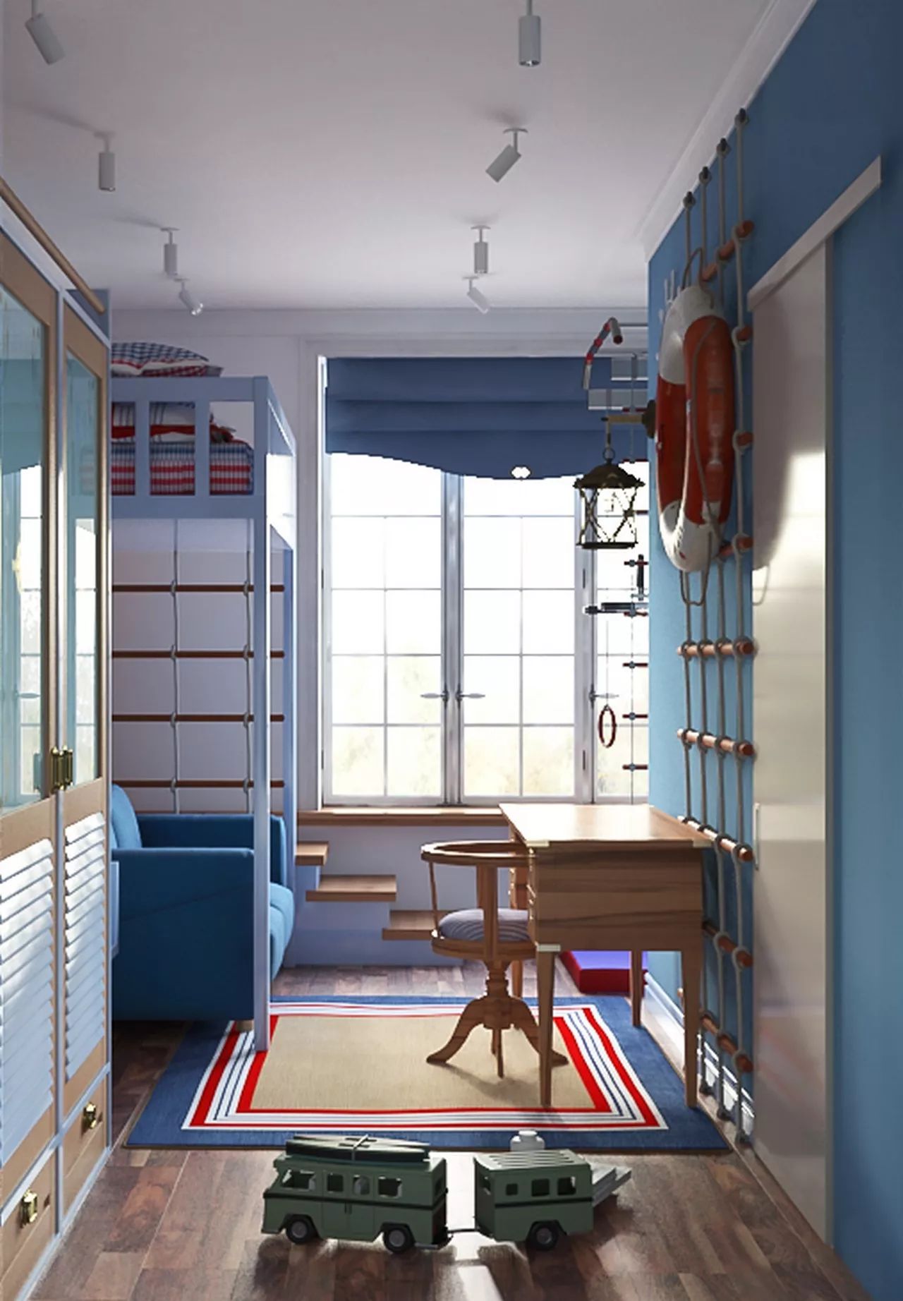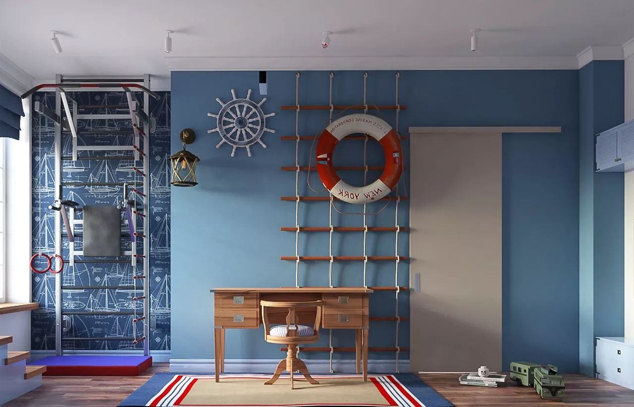 Children’s room for a boy is decorated in a marine theme. The bed is installed above the sofa, as the second tier of the structure. Thus, the child’s dream of a sleeping place “on the second floor” came true and additional space was freed up for guests. A sports corner and a desk were set up by the window.