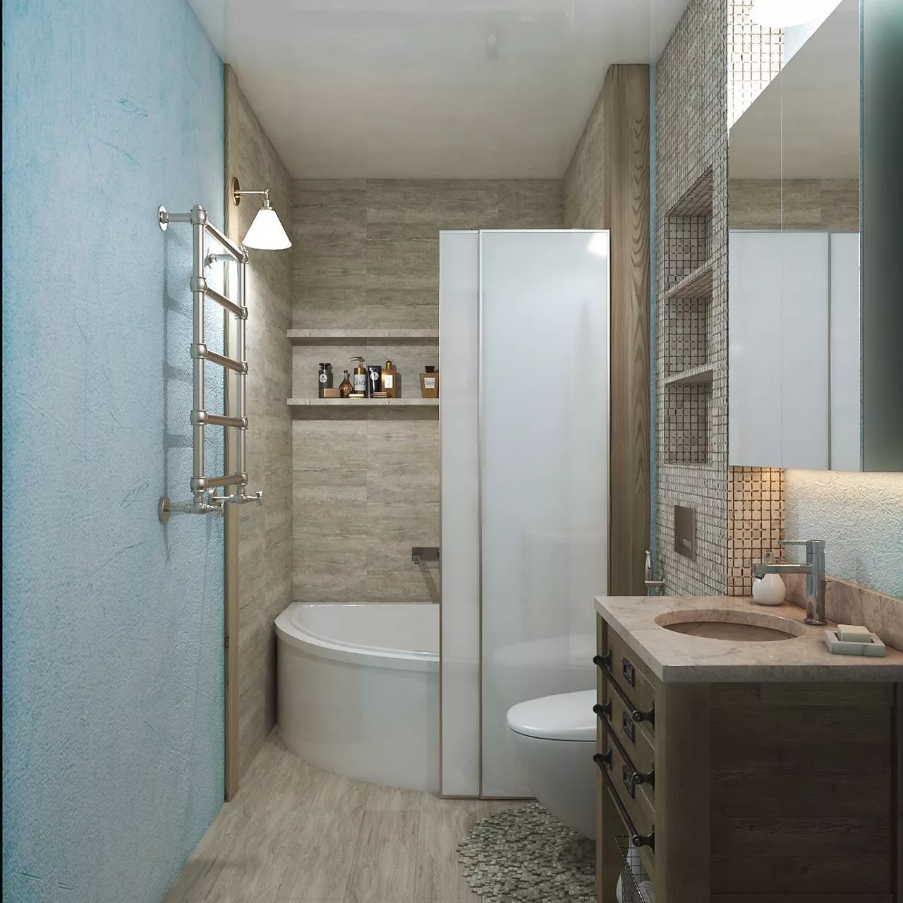 An unusual mix of beige, wood and blue shades was used in the bathroom design. The room is equipped with everything you need, including a bathroom-shower, a stone sink and storage space for cosmetics, household chemicals and other things.