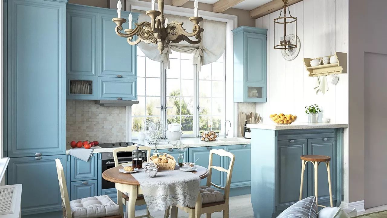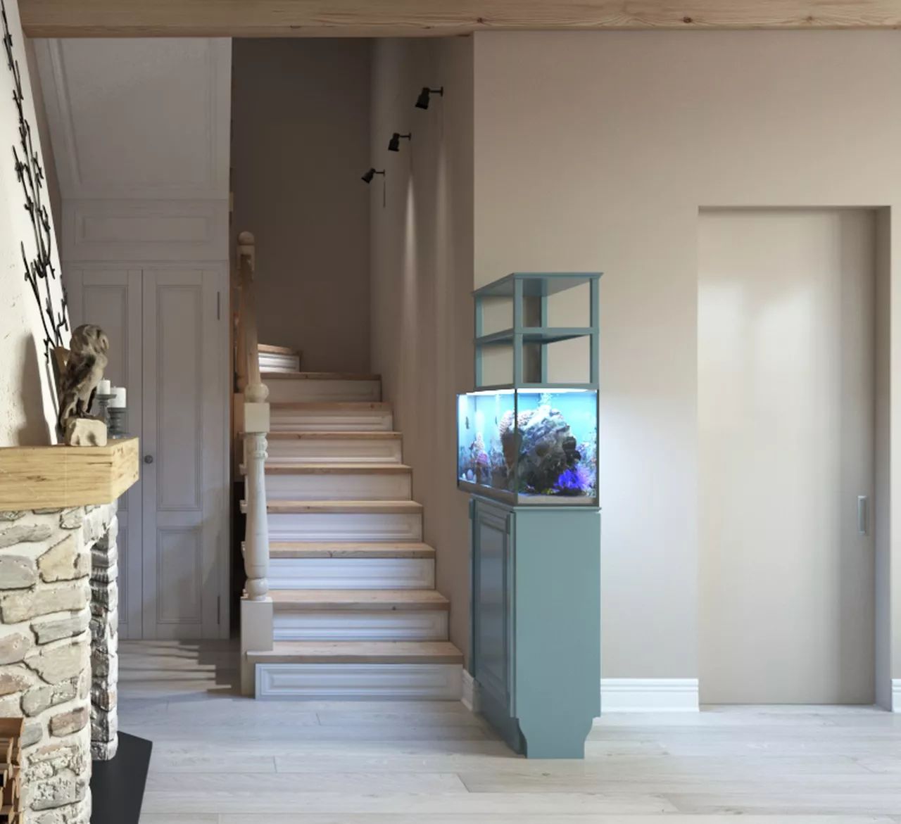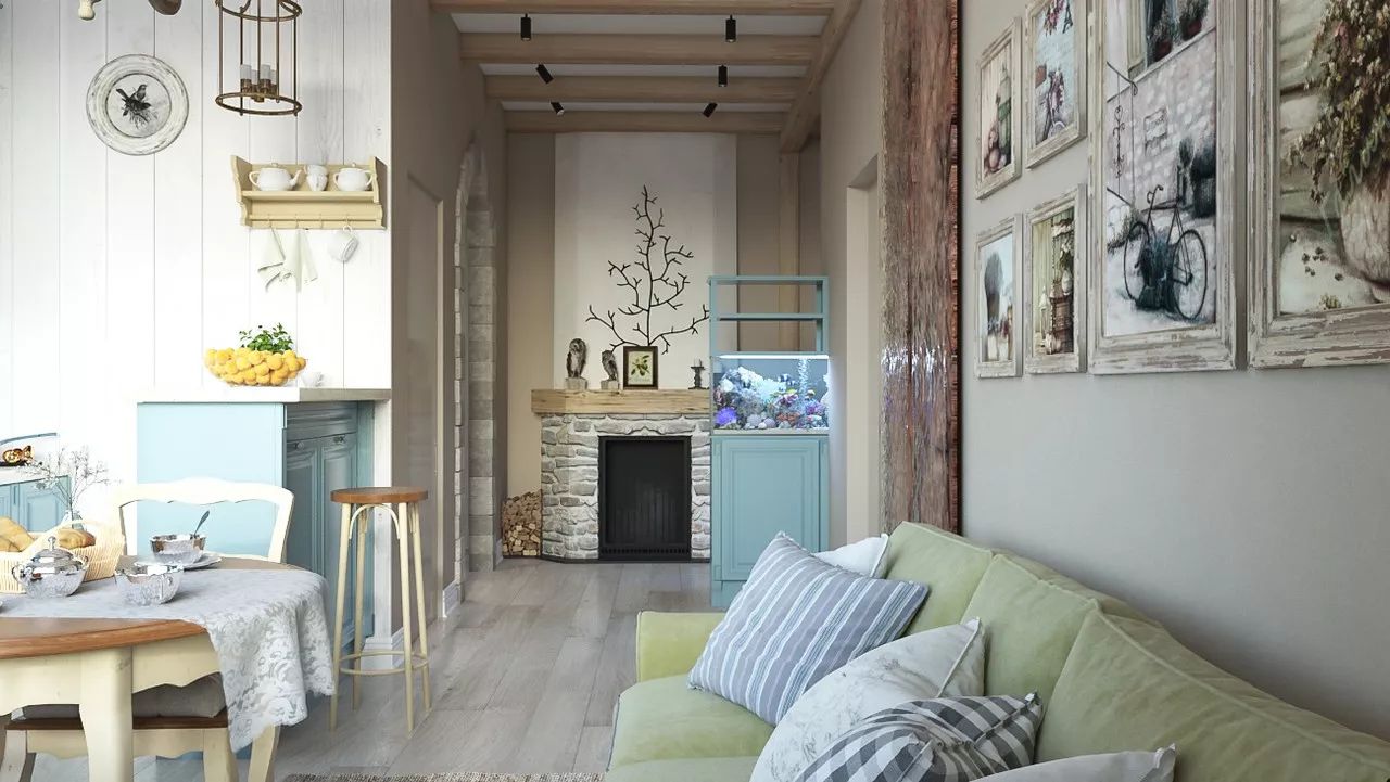 The kitchen-living room is a small but cozy space with a comfortable sofa, TV, dining area and a kitchen with turquoise blue furniture facades. The walls were decorated with decorative plaster and white wood paneling. A fireplace and aquarium are installed in the hallway, but are visible from the living area.