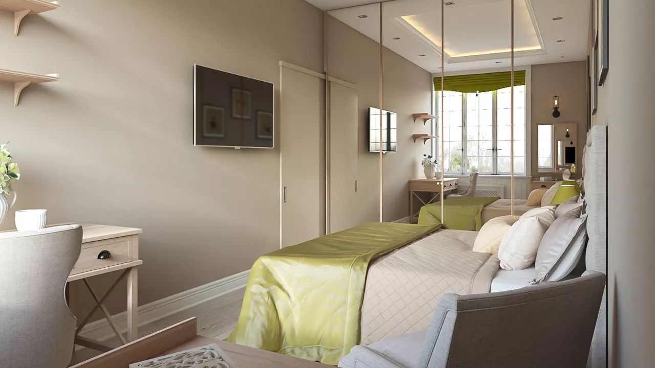 A bedroom is always an atmosphere of calmness and relaxation. The design is based on a warm beige color, with olive green accents. Asymmetry in the arrangement of furniture and large mirrors of the wardrobe brought their zest to the interior.