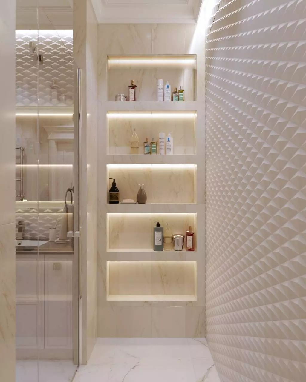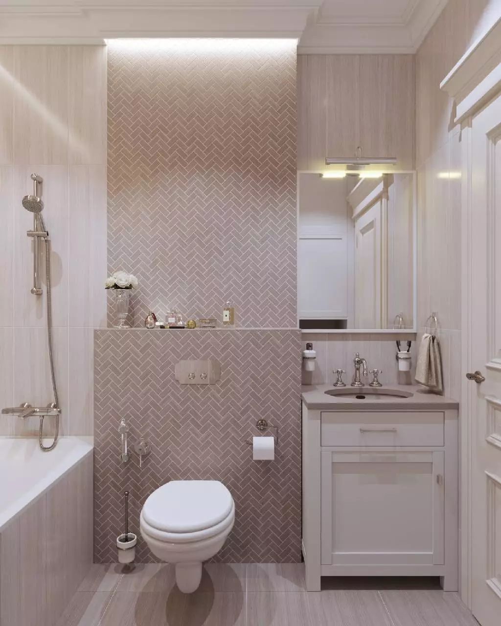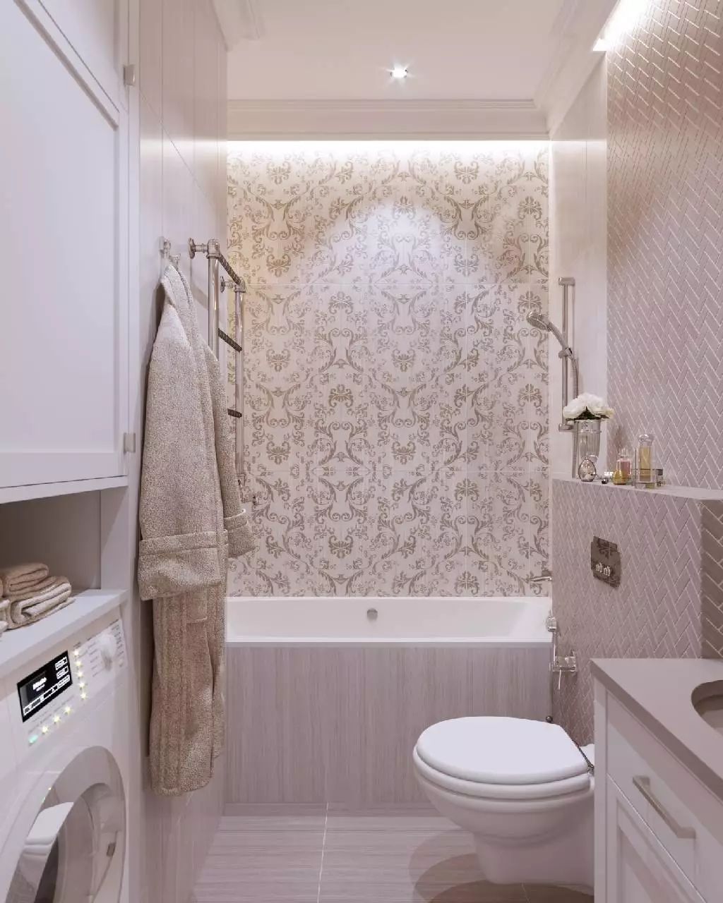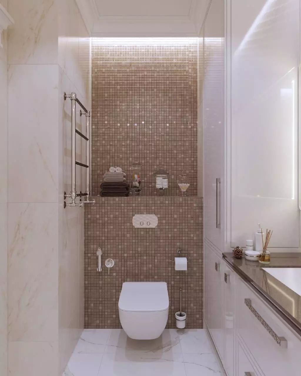 The parents’ bathroom is designed with different patterns of wall decoration – but in the same colors, due to which an unobtrusive and light combination is obtained. A separate bathroom was arranged for my daughter – this solution creates maximum comfort for the whole family.