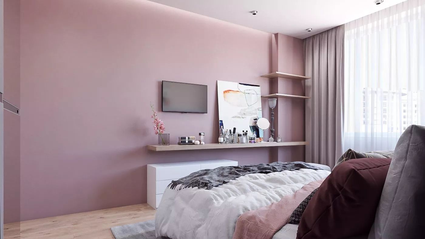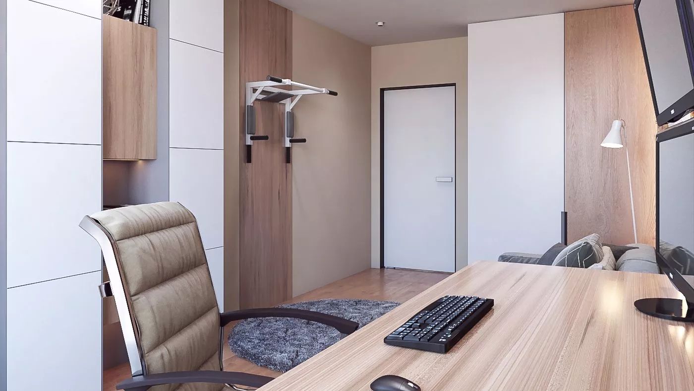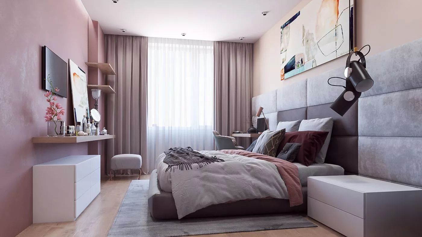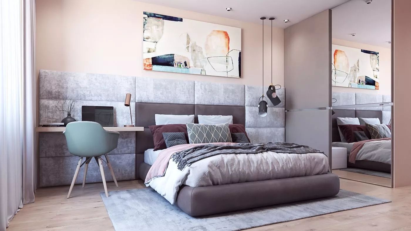 Soft textile panels were chosen to decorate the wall behind the headboard in the bedroom. They also cover the wall in the small work area where you can comfortably sit with your laptop.