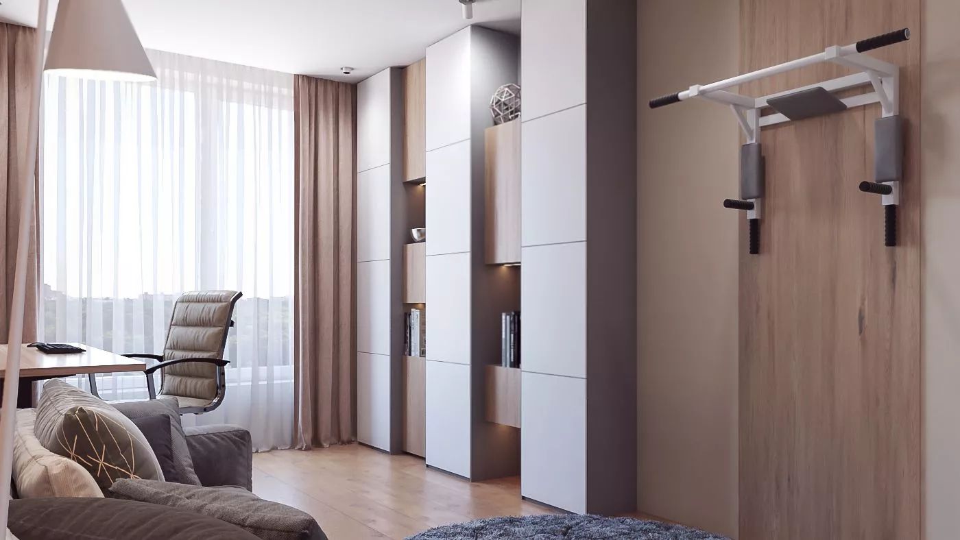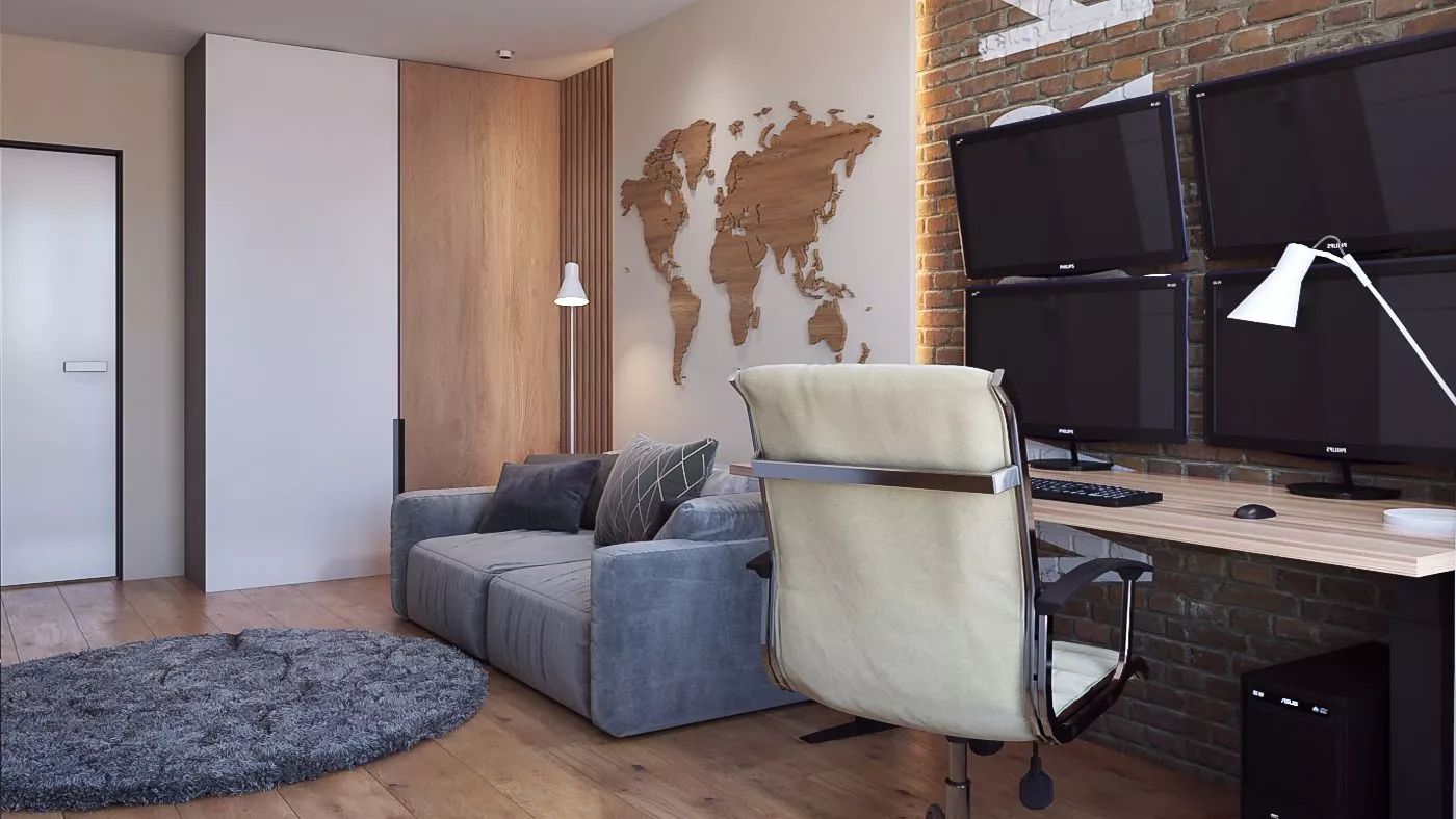 A separate room was allocated for an office – for one of the parents, who often works from home. In addition to the workplace, a small sports corner and a recreation area were also equipped for comfortable breaks. The interior used a lot of wood and brick trim, like in the living room.
