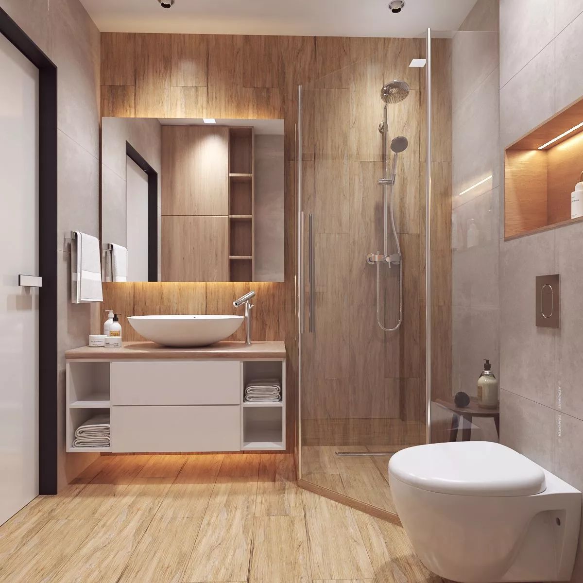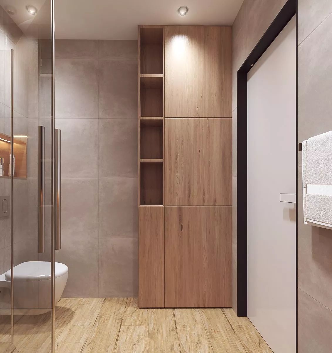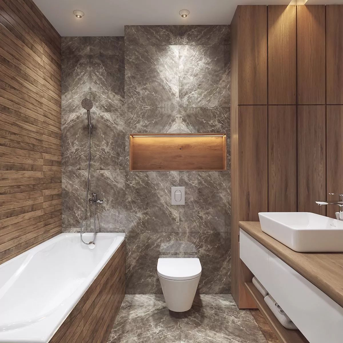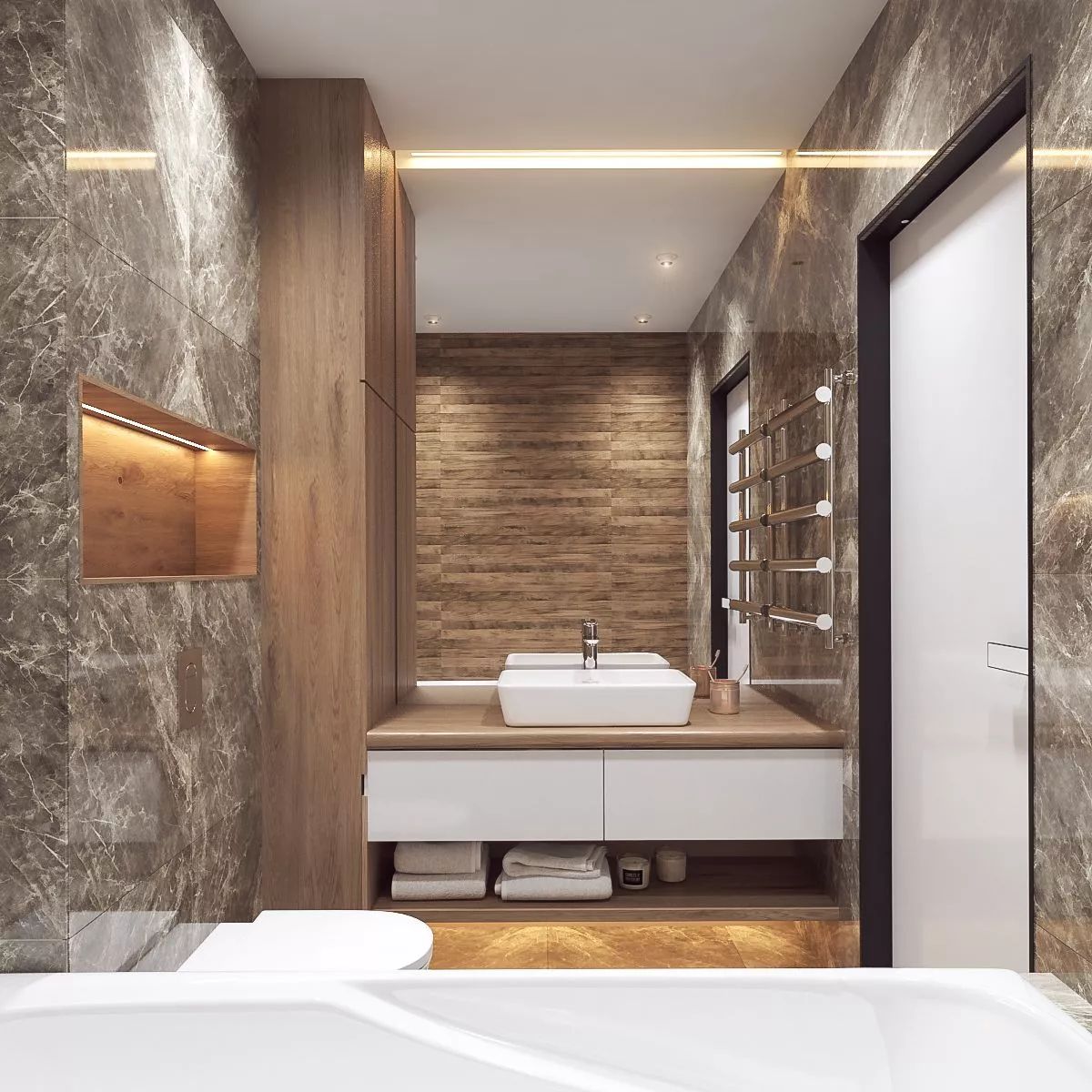 In the design of the bathrooms, the idea of combining stone and wood was continued – but more visually pronounced textures were chosen for the bathroom than for a bathroom with a shower.
