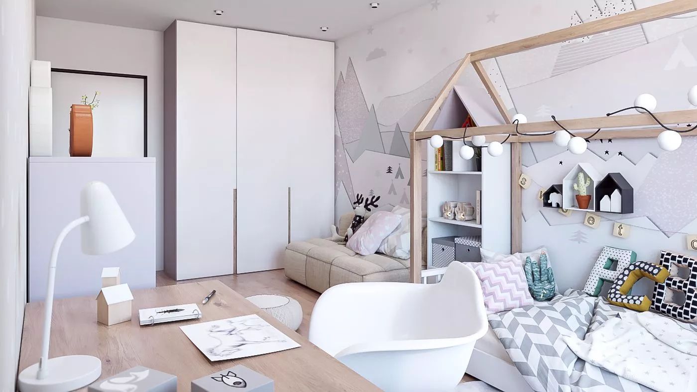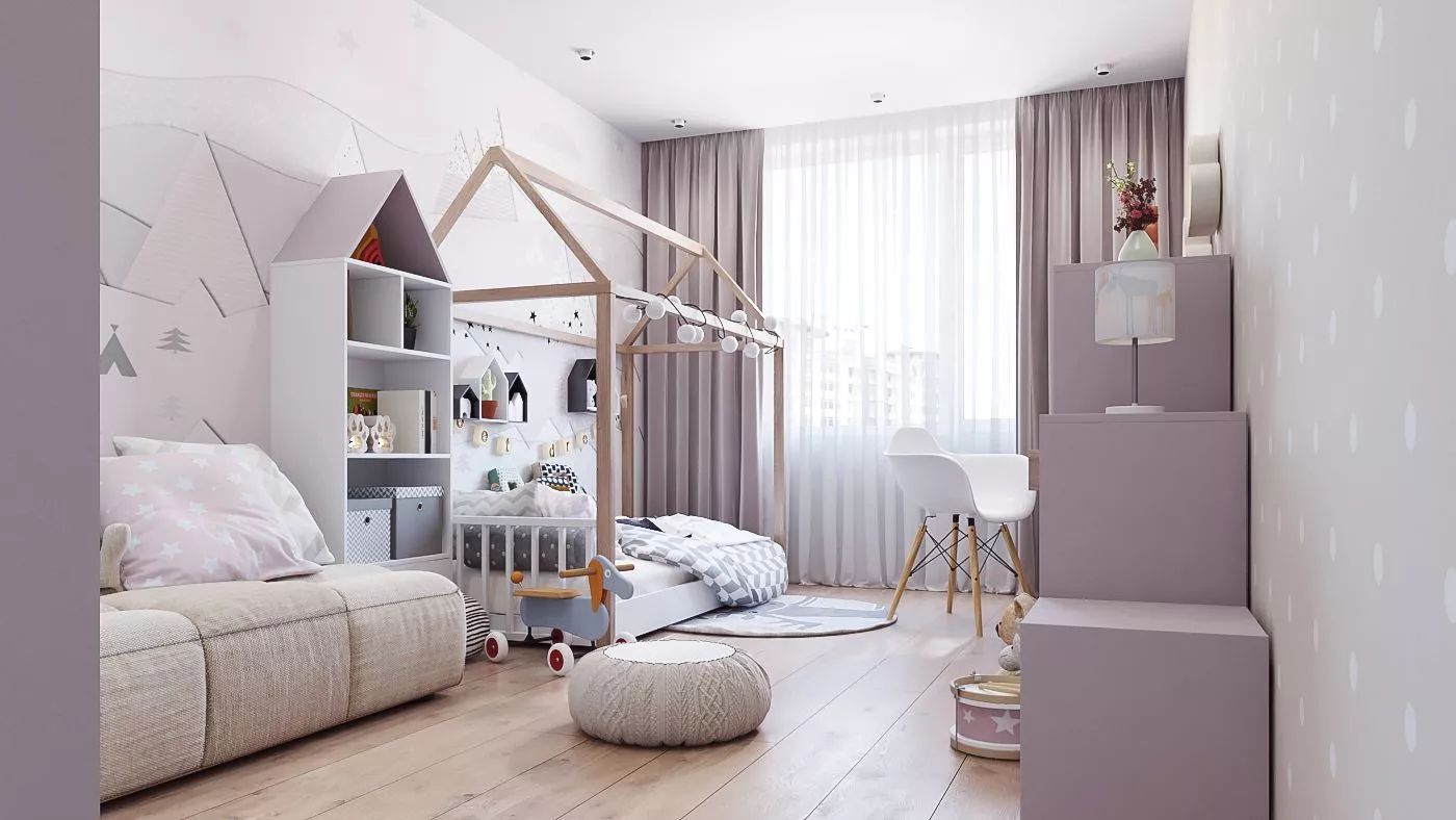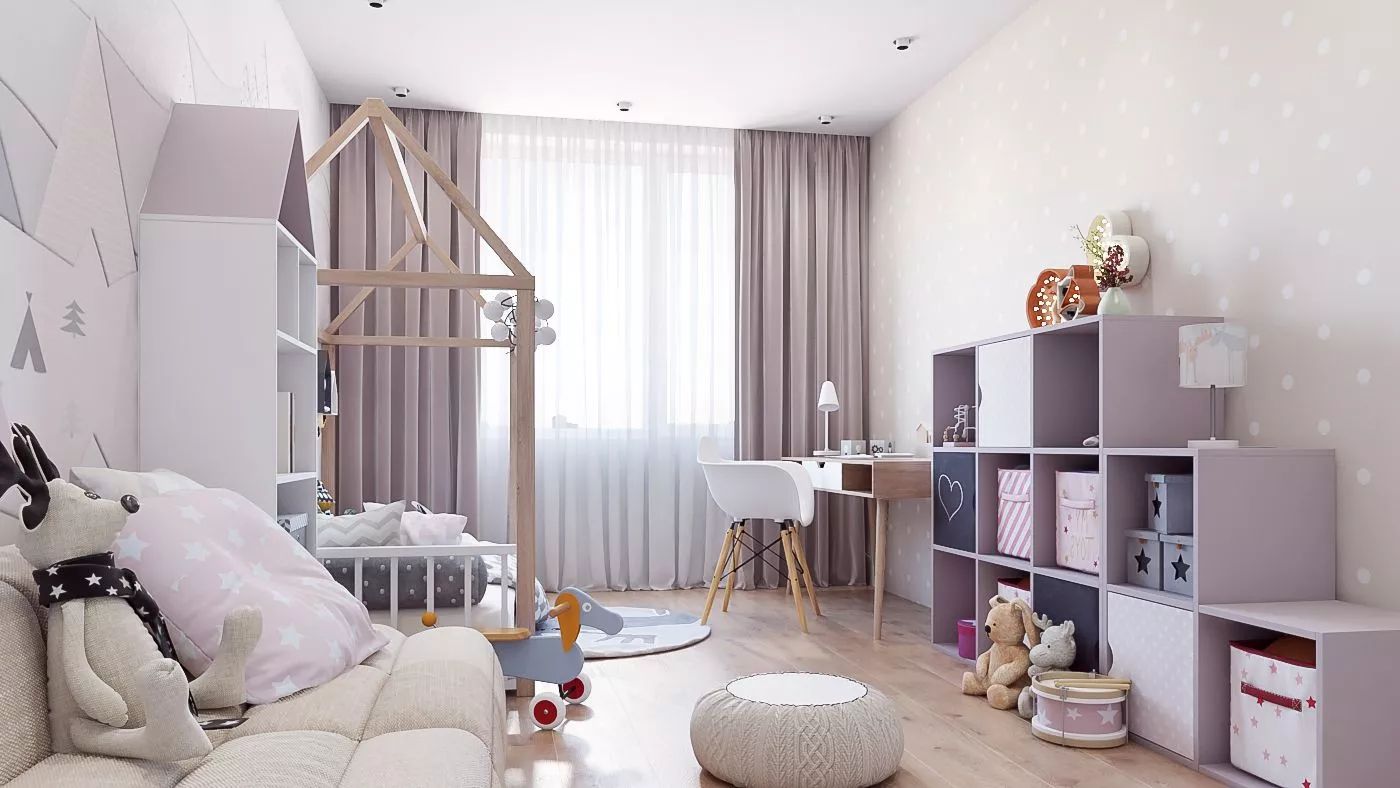 The design of the nursery for the girl is developed in gentle pink colors. All the necessary functional areas are equipped: for recreation, study / creativity, games, storage of things. A bed with an add-on in the form of a house is a small embodied dream of the owner of the room.