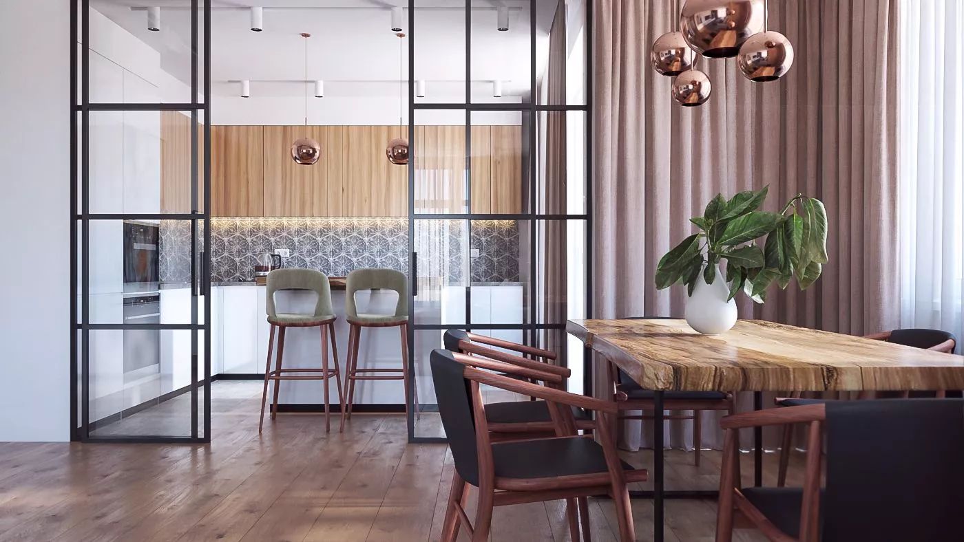 The kitchen and living room simultaneously share a common space and are separate zones – a metal partition with glass has become an elegant solution. The kitchen is small, island type. In a cozy niche by the window, between the kitchen and the living room, a dining area for 6 people was arranged.