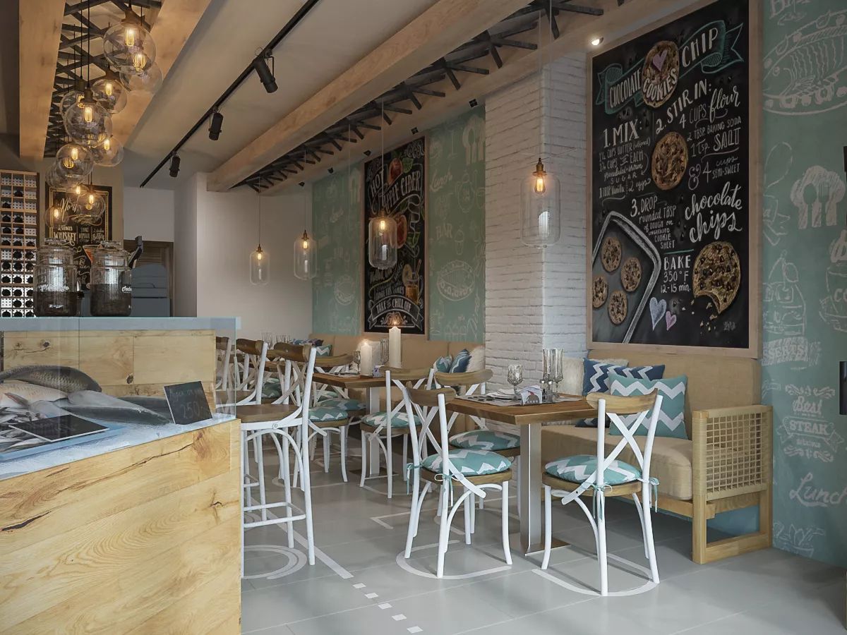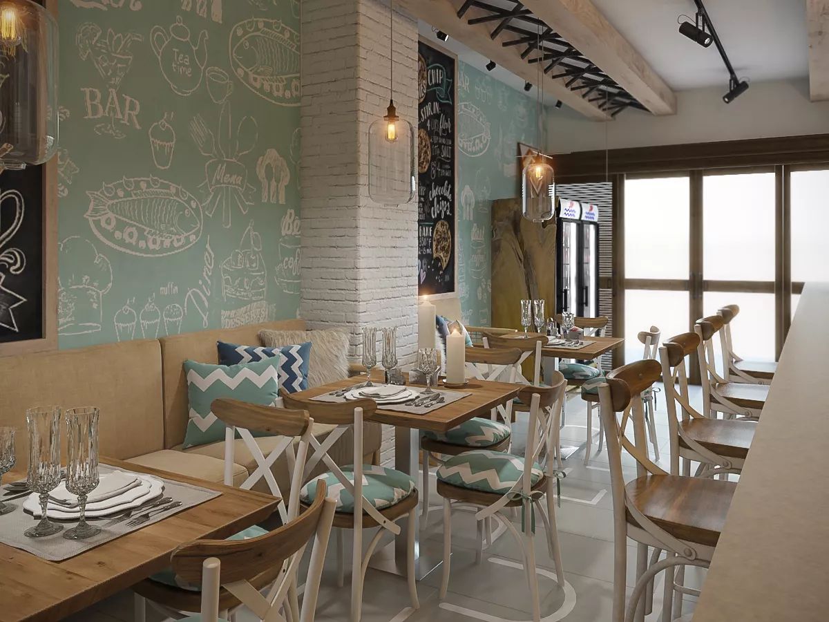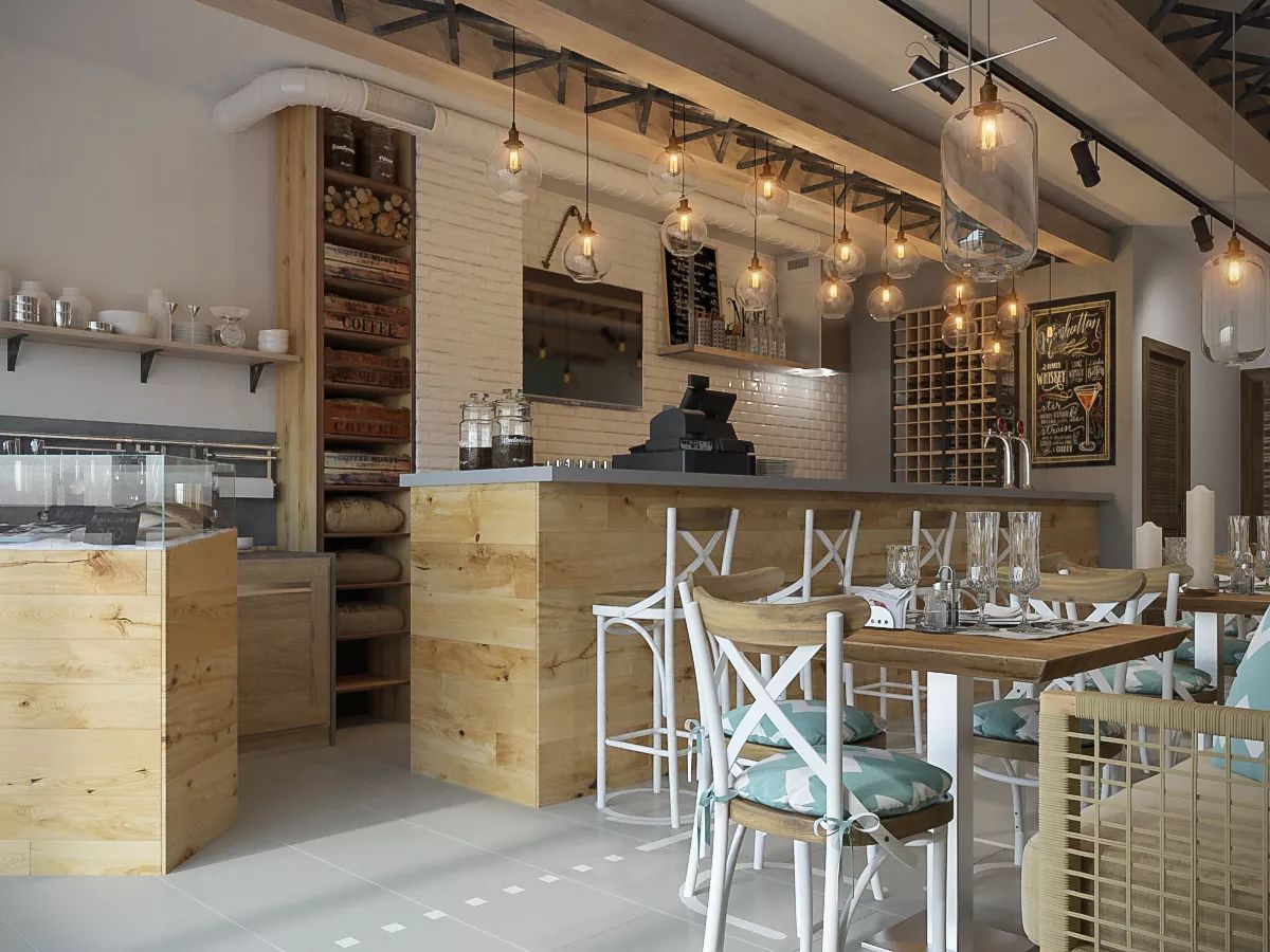 The design project in a modern style was developed for the interior of a small restaurant in Spain. The main task was to combine aesthetics and ergonomics of space. But the environmental friendliness of the design is also important – natural materials were used for finishing surfaces and furniture, among them there is a lot of light wood. The popular white decorative brick was used to decorate the walls. The hall has a long bar counter and several tables with soft sofas and chairs.