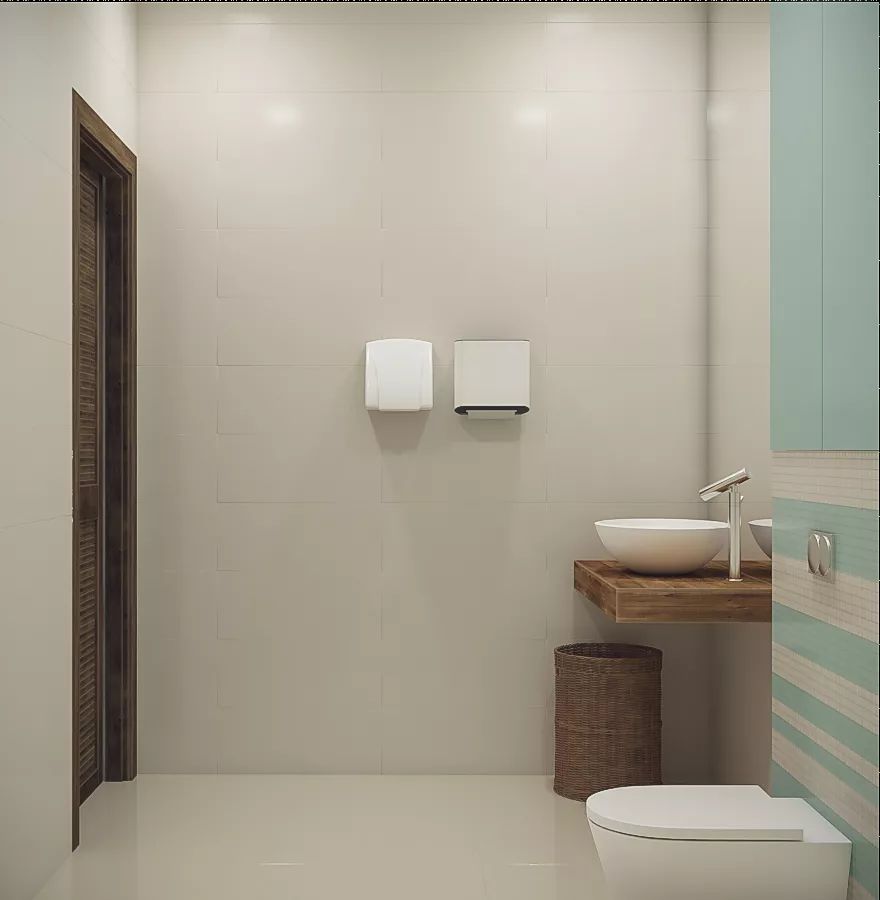 A bathroom for a restaurant project in Spain is a simple, laconic design that supports the overall style of the establishment. Made in shades of mint and wood color.